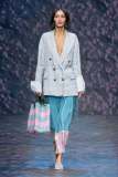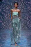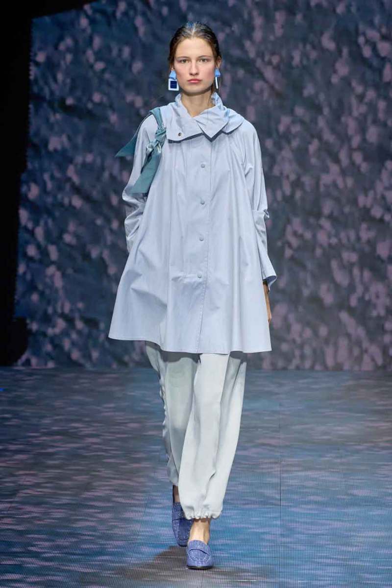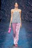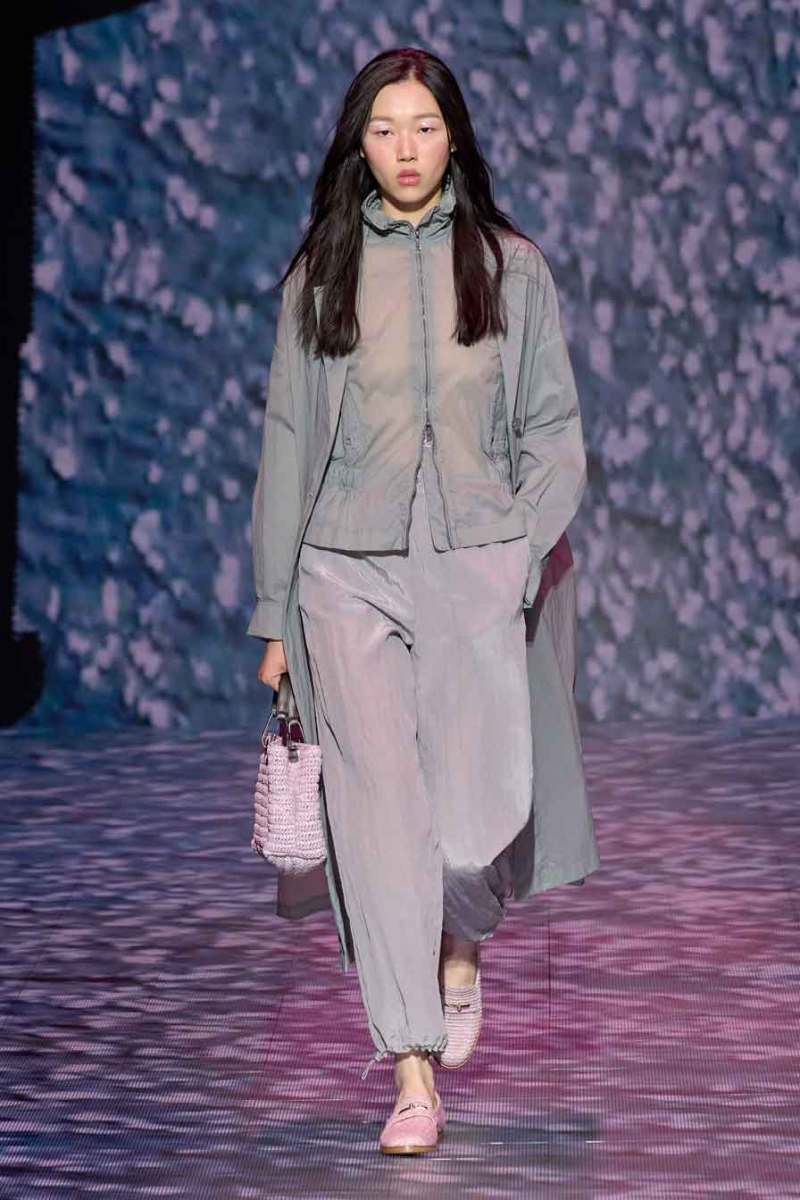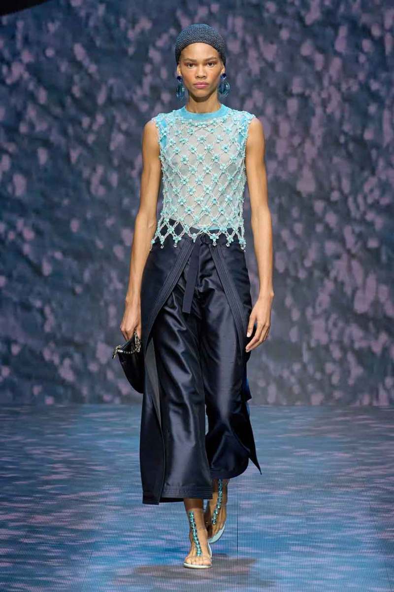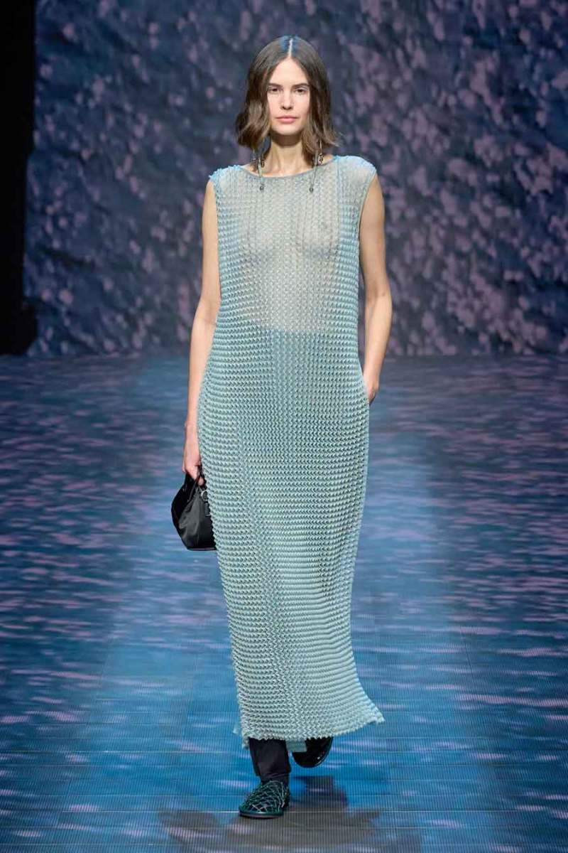 Le modelle sfilano avvolte da capi leggeri e fluttuanti. La palette di colori riprende i toni del bianco, il sabbia e i colori pastello. I tessuti sono morbidi e impalpabili, freschi e leggeri. Top impreziositi da cristalli e canotte con ricami scintillanti sono abbinati a pantaloni setosi e lunghe gonne. Blazer leggeri e morbide camicie sono accostati a pantaloni arabeggianti e gonne pareo, creando un irresistibile mix di stile cittadino e stile vacanziero. Gli abiti lunghi con applicazioni floreali sembrano ondeggiare delicatamente lasciando intravedere la silhouette in modo delicato. Naturalmente, tra gli outfit della donna che veste Emporio Armani non può mancare la giacca, classica o a spolverino, che viene abbinata a comodi pantaloni.