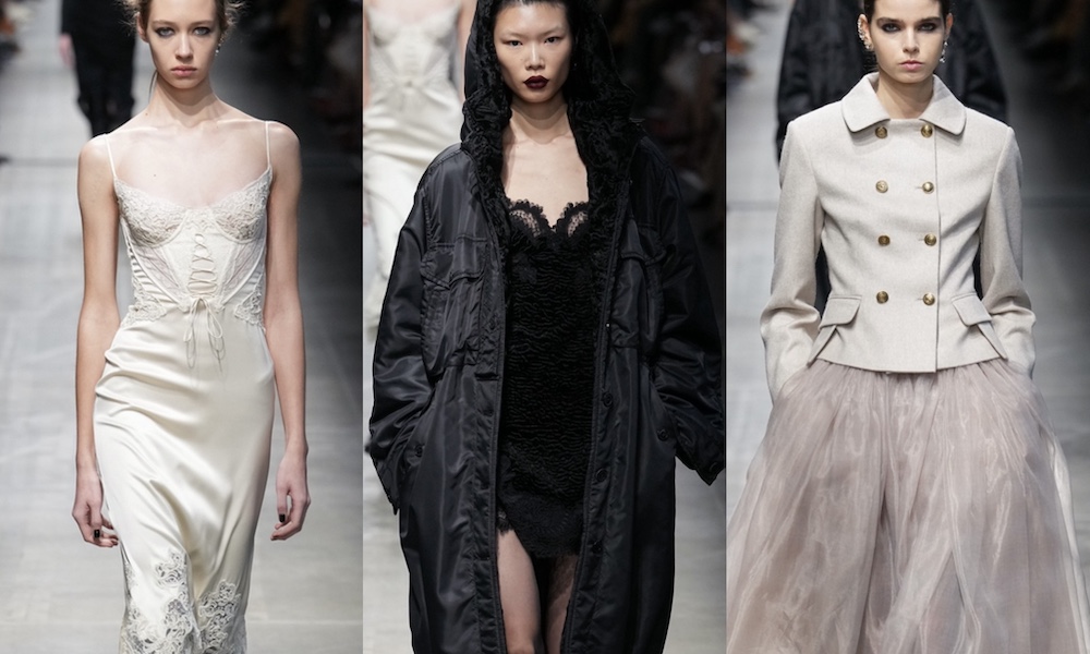 Il cuore della collezione è il dialogo tra elementi opposti. La sartorialità rigorosa dei capispalla e dei completi incontra la leggerezza di sottovesti in pizzo e abiti lingerie. Le silhouette enfatizzano il contrasto tra vita aderente e gonne vaporose, creando un equilibrio tra forza e delicatezza.