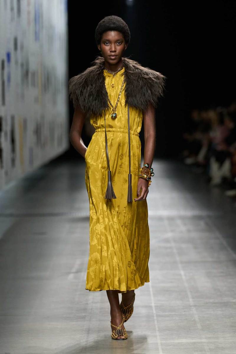 La scelta dei colori è, come sempre, una delle caratteristiche distintive del brand. La collezione A/I 2025-26 di Etro è un’esplosione di tonalità calde e terrose, dal rosso intenso al verde smeraldo, passando per toni di blu, oro e beige. L’effetto è quello di una bellezza naturale, che richiama i colori dei paesaggi e delle tradizioni che hanno ispirato Kean Etro nel suo lavoro.