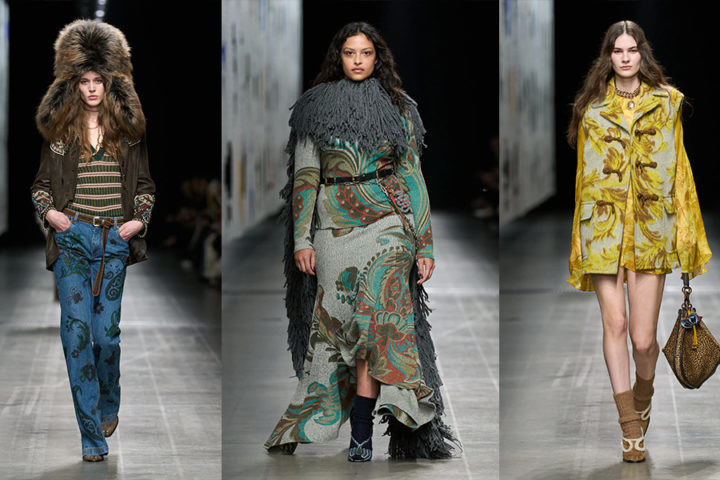 Veronica Etro vede la sua donna nomade, a tratti amante dello stile dandy, e poi libera e desiderosa di uno stile di ispirazione equestre in chiave molto argentina. Tutti i look sono un viaggio, dai cardigan jacquard indossati come minidress ai completi all’inglese con camicia in seta e nodo al collo o con dettagli di rouches in broderie anglaise. I pantaloni in pieno stile sarong, talvolta percorsi da frange, interloquiscono con giacche trapuntate, piccoli gilet, poncho e plaid che portano dall’Argentina ai Balcani, per un inverno sensuale ed avvolgente.
