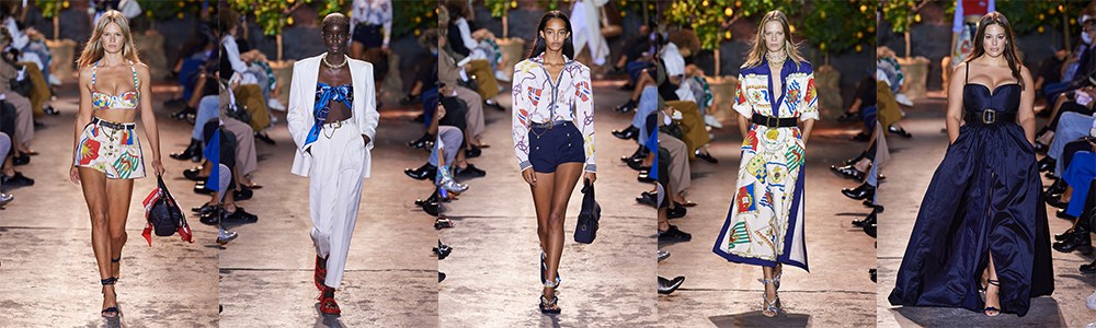 Sullo sfondo di un quadretto idilliaco mediterraneo fatto di verdi alberelli da cui spunta un limone qua e là, le modelle si muovono sinuose in abiti colorati e leggeri. La nostalgia di un’estate italiana e la speranza di una prossima, libera da mascherine, sono i sentimenti che trasudano da ogni capo. Il tema nautico, infatti, con corde, conchiglie, ancore, righe, ha il solo scopo di dare un tributo al Bel Paese. Il logo del Pegaso-Tritone sulle t-shirt aiuta a inquadrare ancora di più il tema, unito all’iconico Paisley, immancabile ormai, quest’anno in versione monochrome.