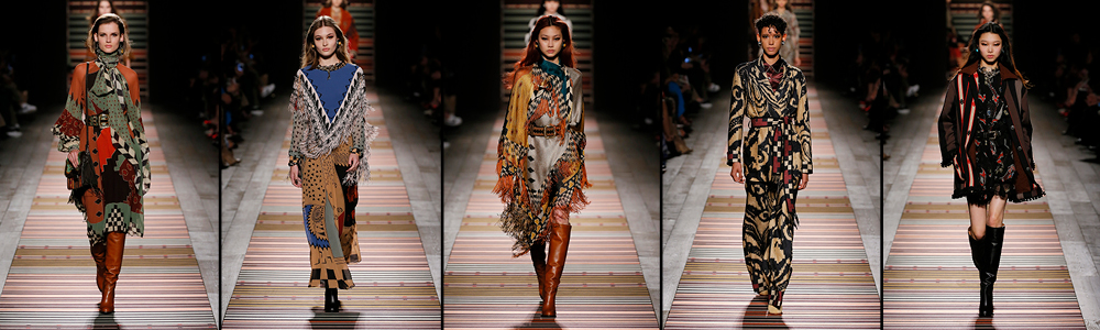 La sfilata di Etro Fall/Winter 2018-19 presentata alla Milano Fashion Week è un viaggio in cui Veronica Etro ci conduce attraverso un binomio interessante: le polverose praterie americane e la sensibilità grafica delle arti decorative europee. Lo stile che vediamo in passerella viene definito folk decò, un mix di colori, tessuti e stampe, quest’ultime modellate interamente a mano e in 3D con estrema precisione.
