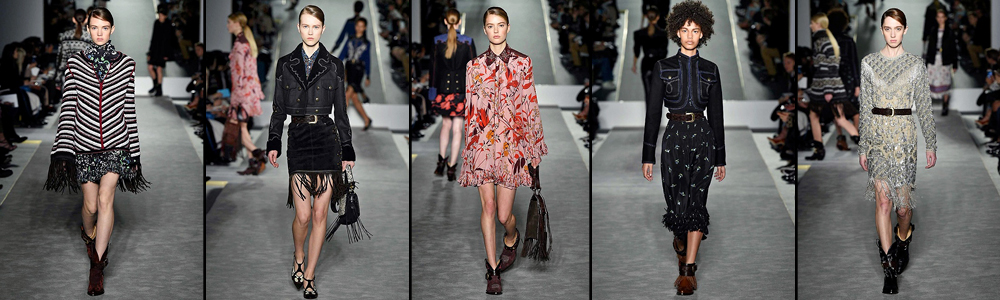 Camperos da Cowboy e frange in pelle, bisacce e cinturoni ci riportano al Far West mentre i tagli sartoriali definiscono una nuova interpretazione dello stile Country, che si contamina con stampe e motivi tipici dei Nativi Americani come a stabilire una tregua tra le parti, unendone culture e leit motiv.
