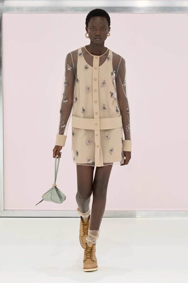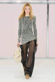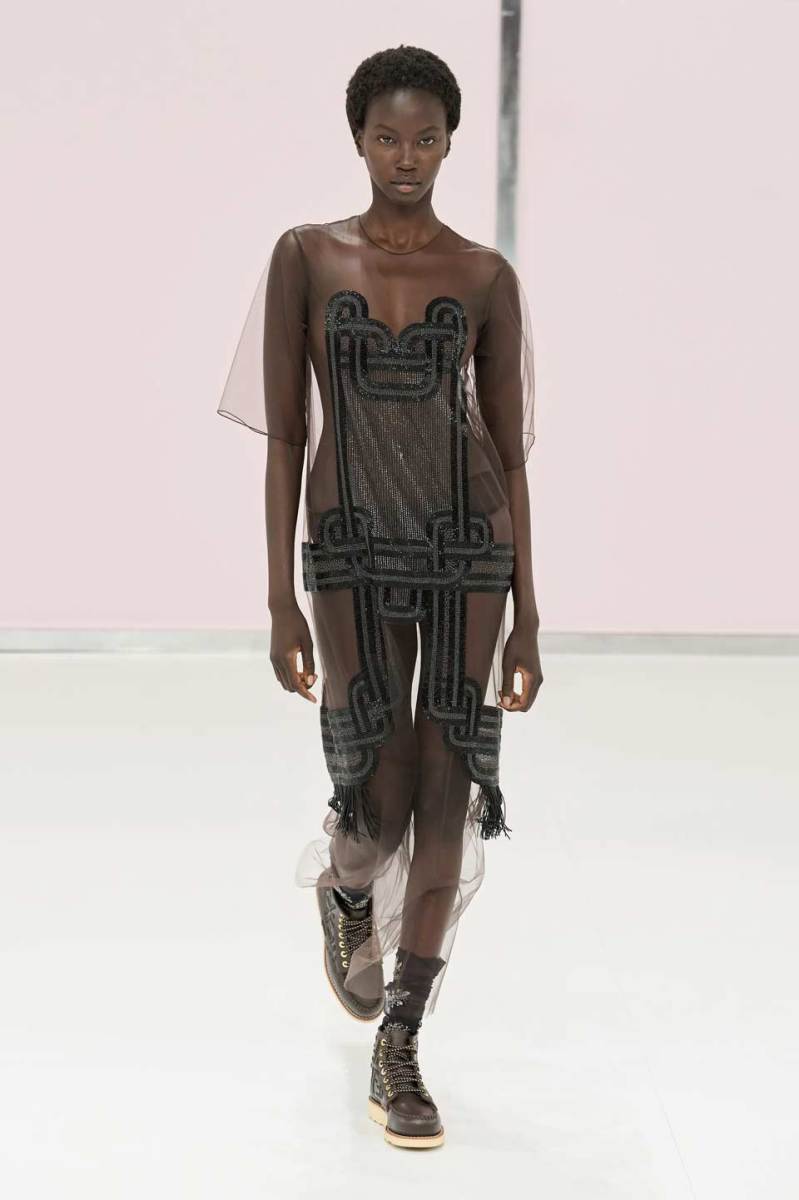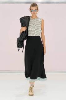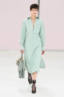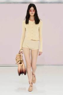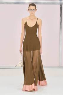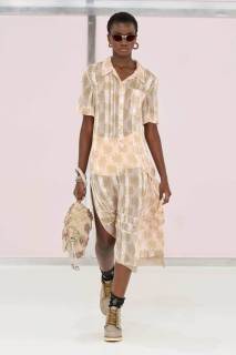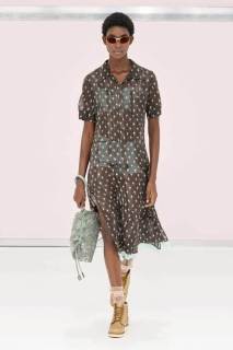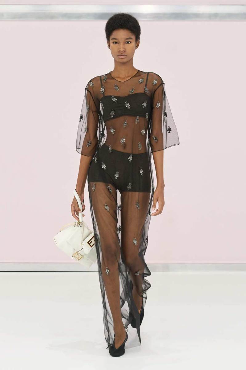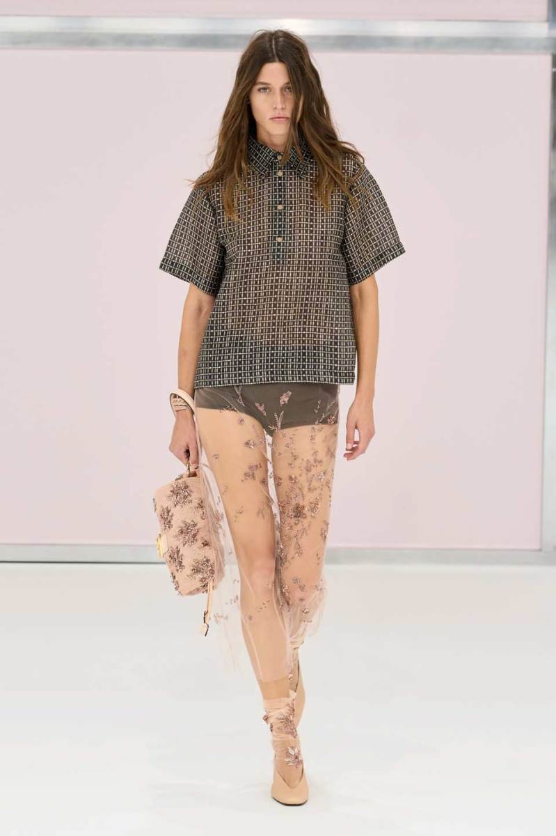 Una voce narrante introduce il primo look di Anok Yai, si tratta di un vestito geometrico dotato di trasparenze asimmetriche che donano sensualità e delicatezza al capo. Gli outfit successivi riprendono, anch’essi, la filosofia del primo con l’aggiunta di altri inserti: le frange e, ancora una volta, il vedo non-vedo. Eleganza, freschezza e colori monocromi caratterizzano la nuova stagione di Fendi per l’avvenire estivo. Successivamente, invece, assistiamo alla comparsa di voci intercalate che scandiscono i passi delle modelle, le quali, poi, sfilano secondo una sequenza prestabilita che si raccoglie intorno alla struttura principale. Camicie, canottiere bianche, abiti midi e gonne ampie svolazzanti e scivolate; assistiamo al ritorno della raffinatezza e della sobrietà. In questo caso compaiono anche degli accessori, che risultano essere ben coordinati: occhiali da sole, orecchini a cerchio e pendenti, insieme a borse color pastello per il giorno.