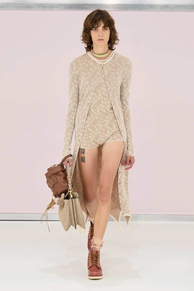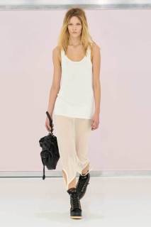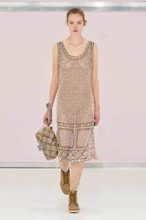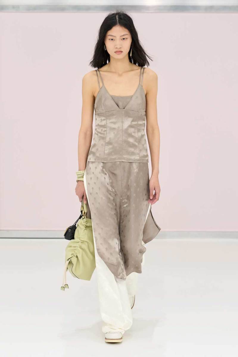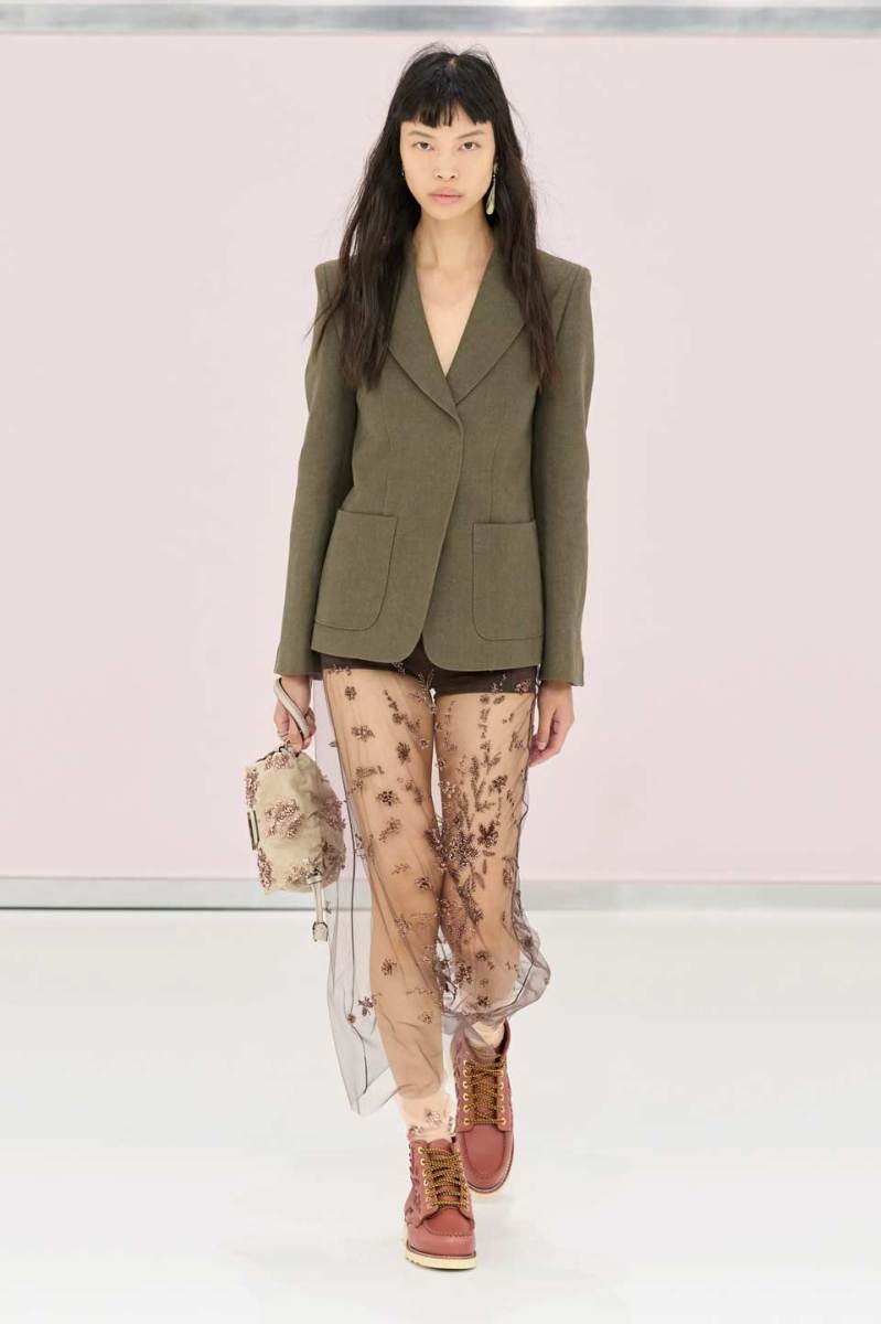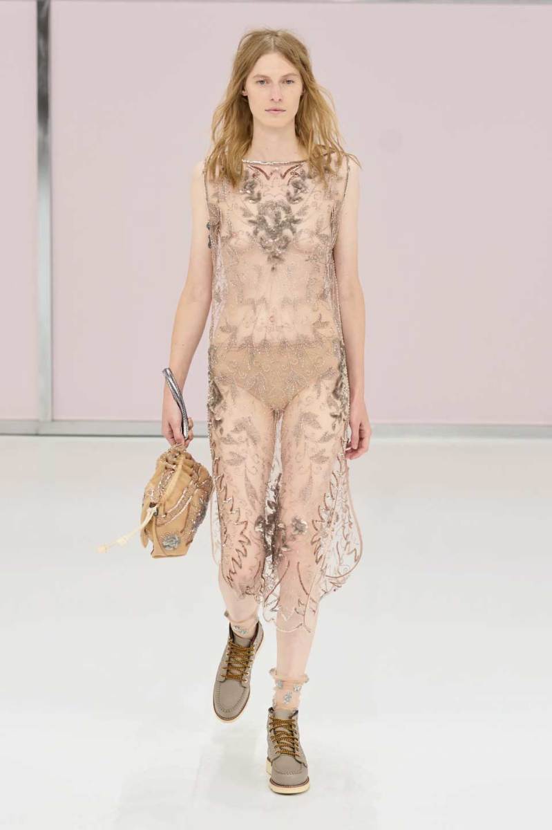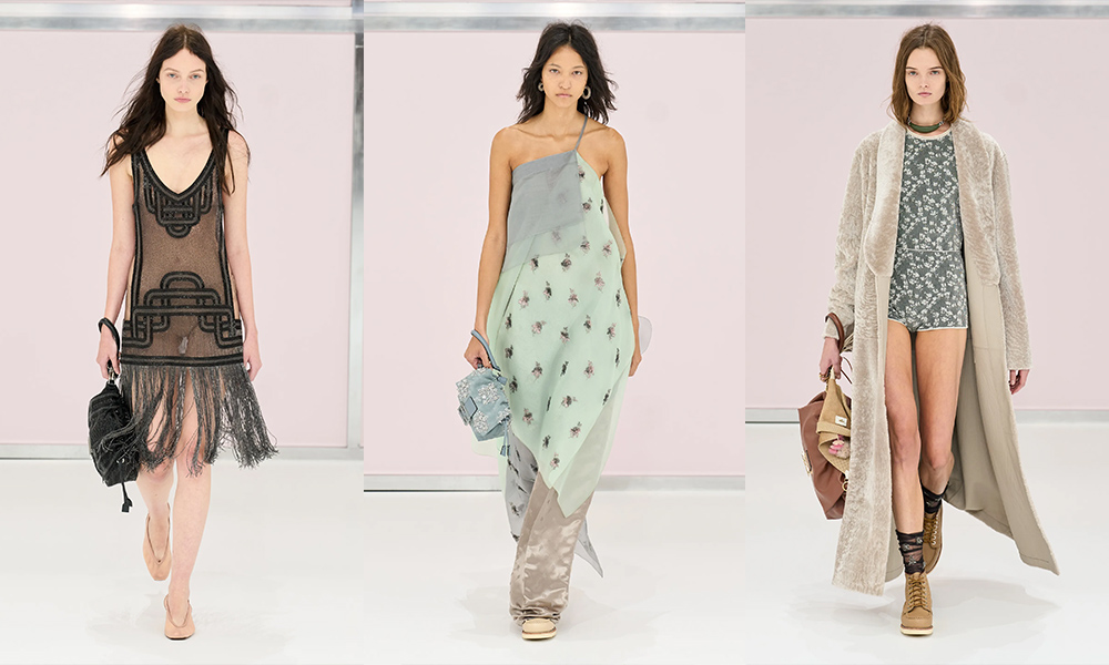 Una voce narrante introduce il primo look di Anok Yai, si tratta di un vestito geometrico dotato di trasparenze asimmetriche che donano sensualità e delicatezza al capo. Gli outfit successivi riprendono, anch’essi, la filosofia del primo con l’aggiunta di altri inserti: le frange e, ancora una volta, il vedo non-vedo. Eleganza, freschezza e colori monocromi caratterizzano la nuova stagione di Fendi per l’avvenire estivo. Successivamente, invece, assistiamo alla comparsa di voci intercalate che scandiscono i passi delle modelle, le quali, poi, sfilano secondo una sequenza prestabilita che si raccoglie intorno alla struttura principale. Camicie, canottiere bianche, abiti midi e gonne ampie svolazzanti e scivolate; assistiamo al ritorno della raffinatezza e della sobrietà. In questo caso compaiono anche degli accessori, che risultano essere ben coordinati: occhiali da sole, orecchini a cerchio e pendenti, insieme a borse color pastello per il giorno.
