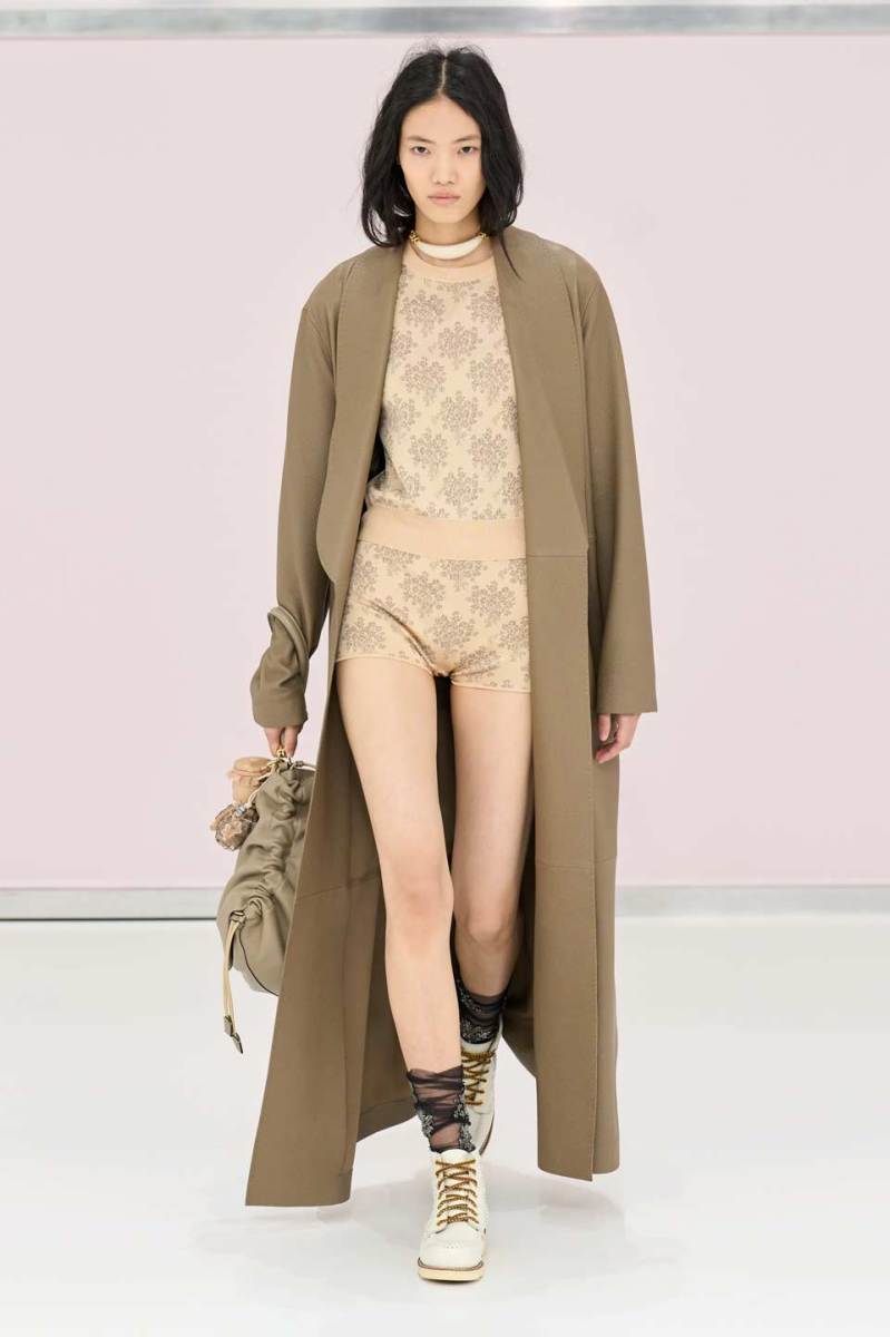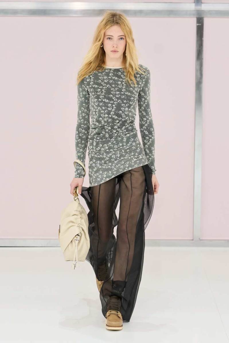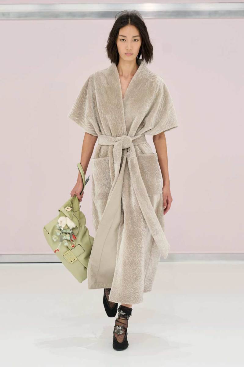 L’atmosfera della passerella Fendi vira sui toni freschi del lilla e ci dona un delicato approccio al tema della primavera e dell’estate 2025. Al centro della sala troneggia, invece, una scultura geometrica realizzata da pannelli uguali tra loro per dimensione e misure, costituendo un imponente punto di riferimento per gli invitati al défilé. Improvvisamente, però, le luci si spengono ed è subito magia.