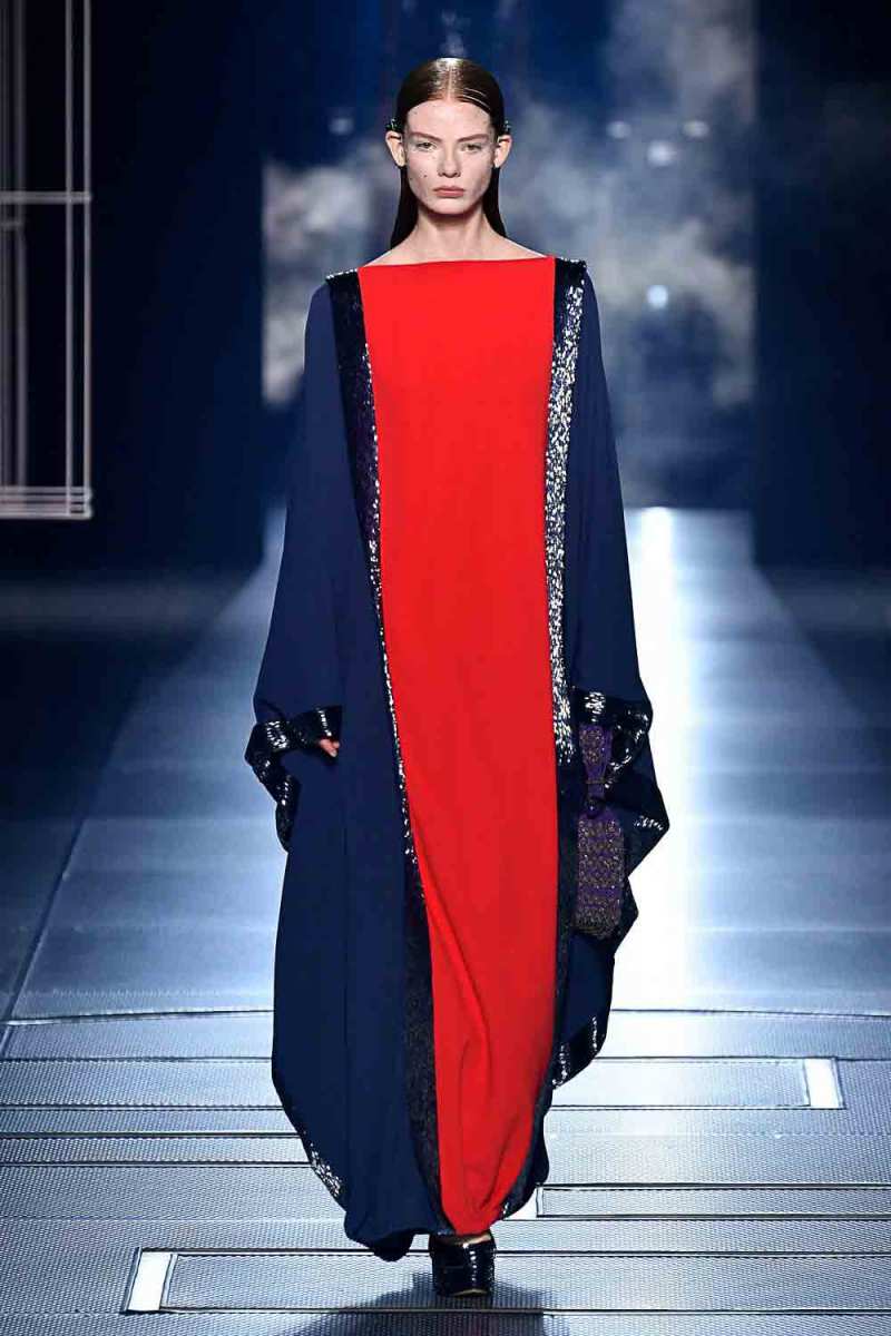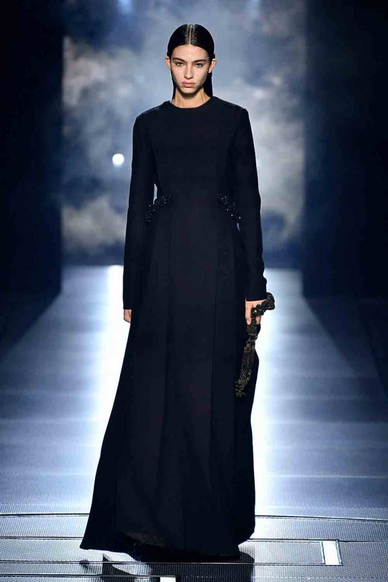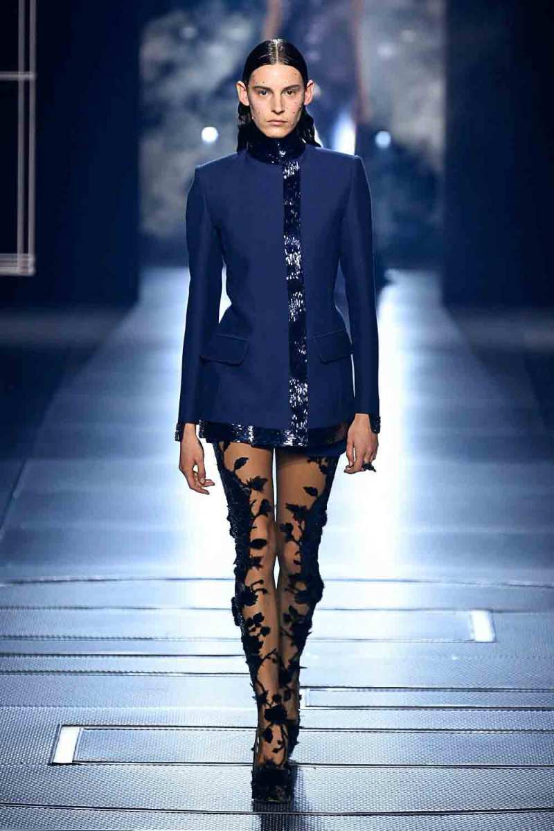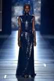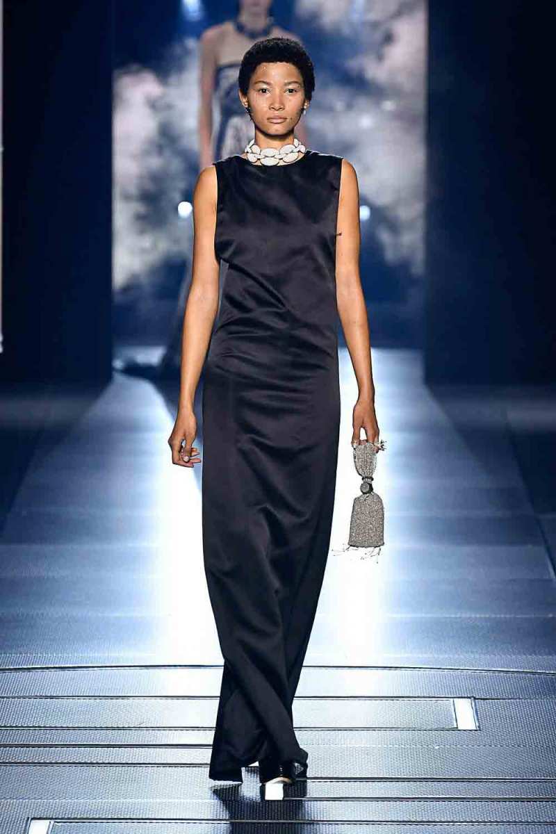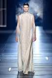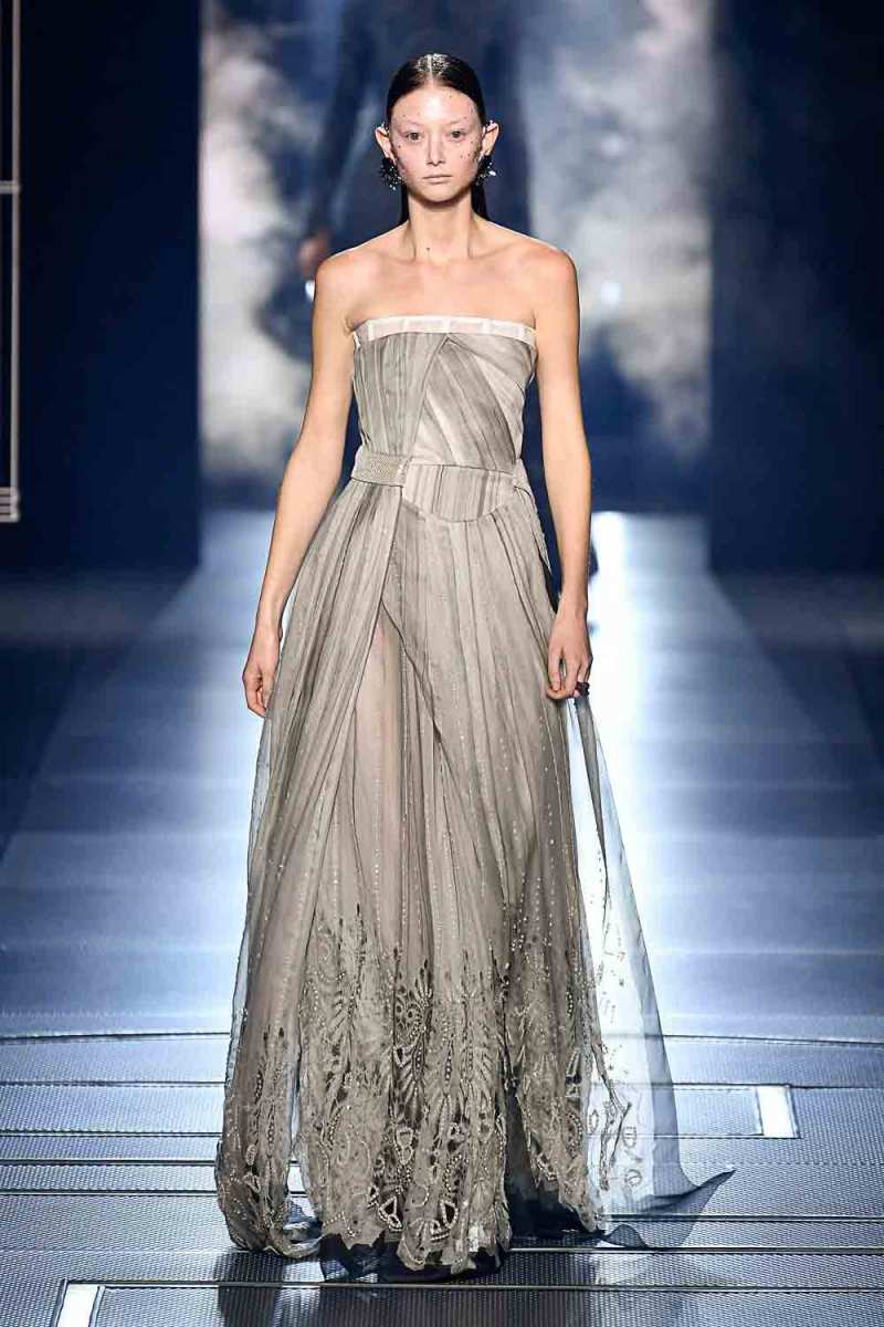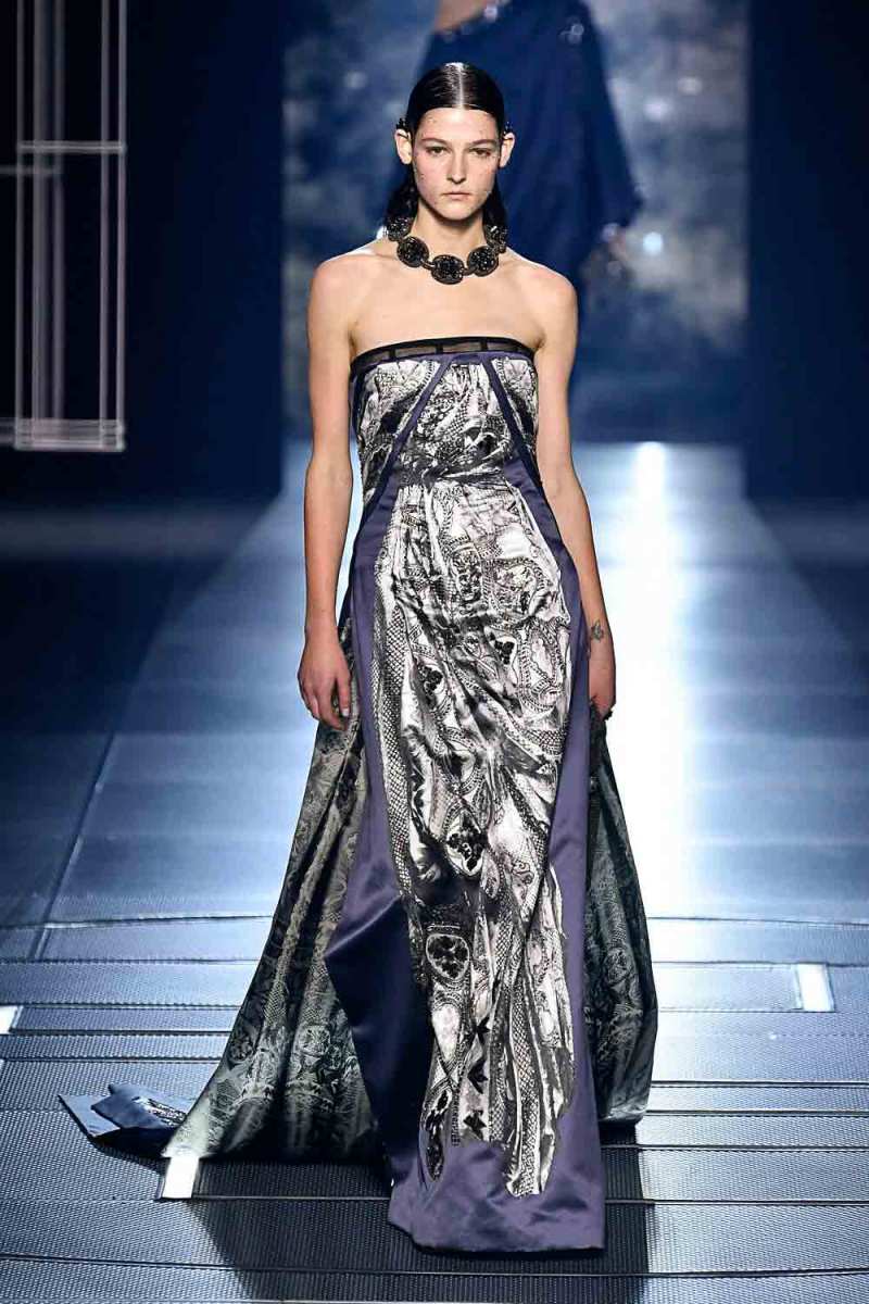 I tessuti si presentano come morbidi e fluidi, sono presenti drappeggi scintillanti con perle, perline e baguette luminose. Accessorio che fa da padrone sono i collant ricamati che fungono da seconda pelle, accompagnati da visoni, velluti e pelli trasformate. Gli abiti creano ombre e scie di seta duchesse, organza e altri tessuti opulenti per tutta la runway, senza rinunciare al tocco di luce e di sfarzo che cattura l’attenzione.