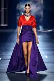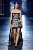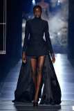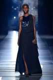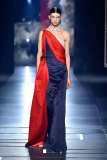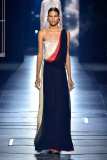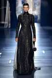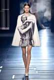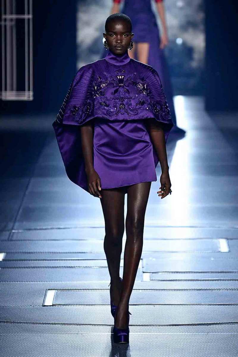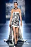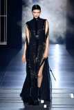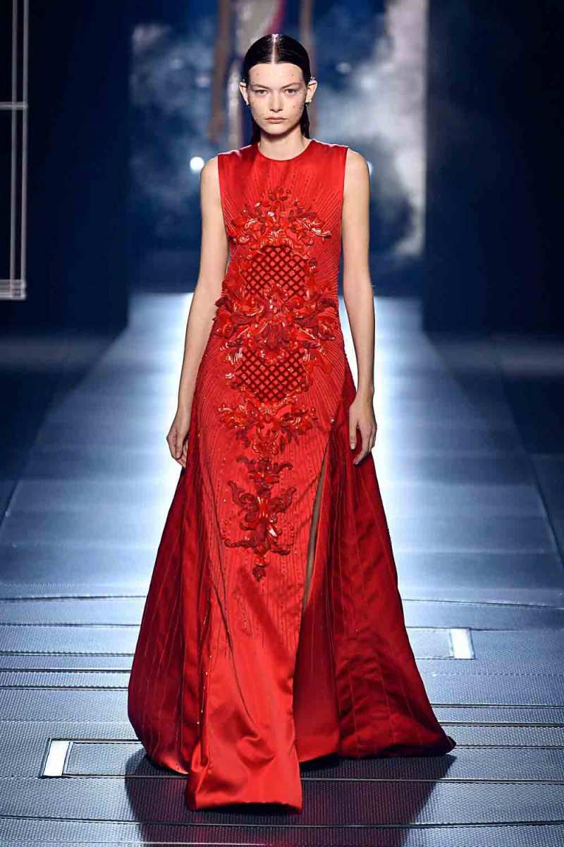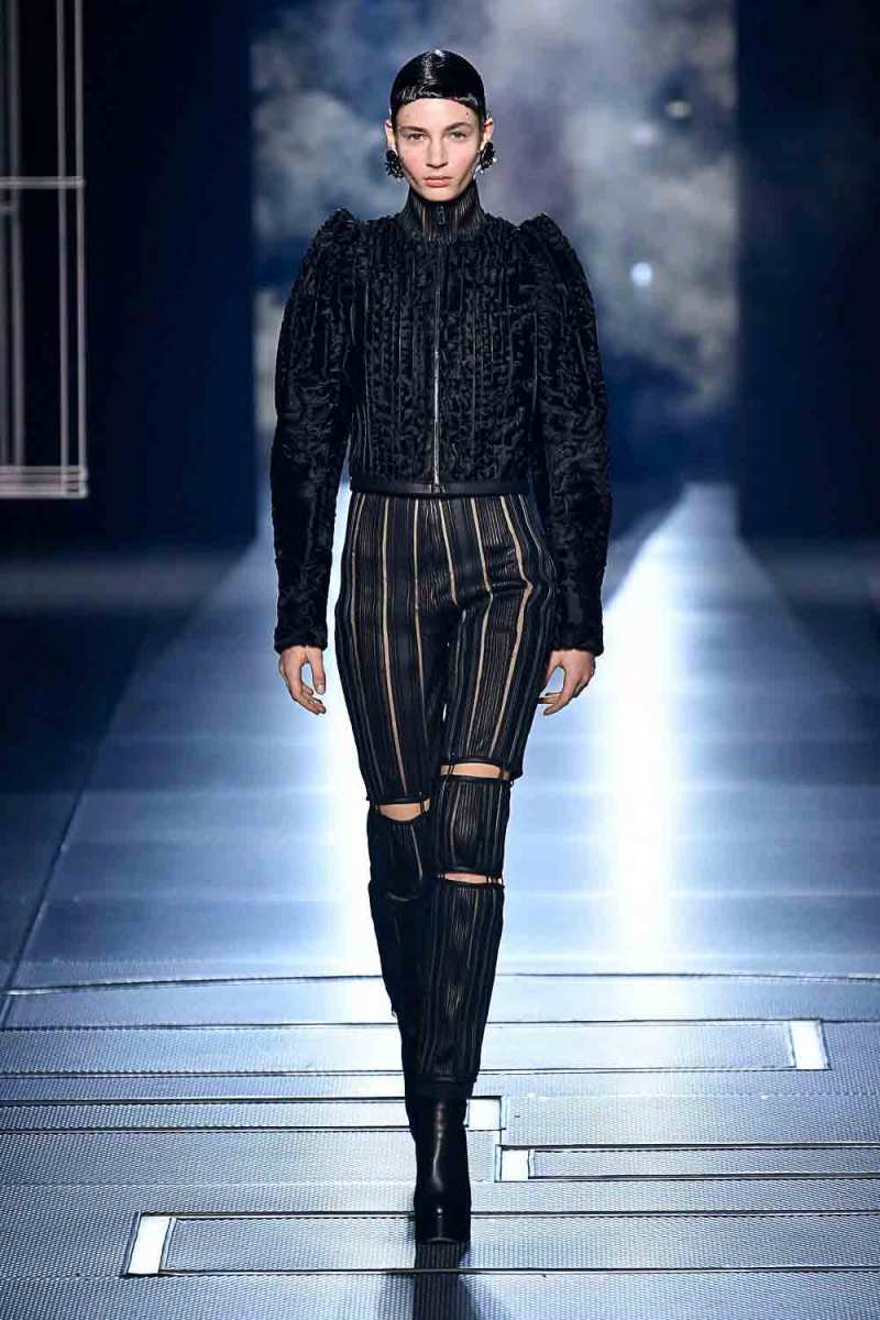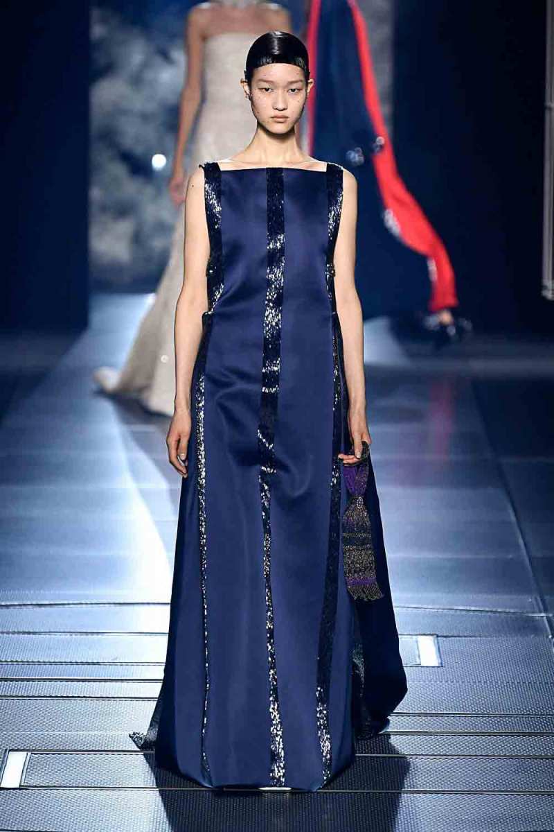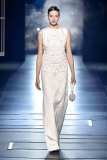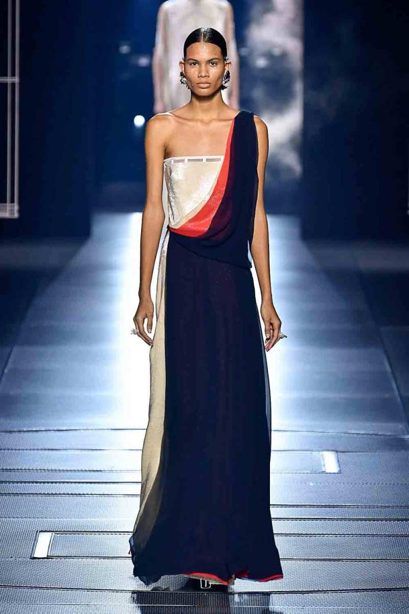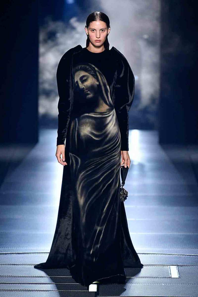 I tessuti si presentano come morbidi e fluidi, sono presenti drappeggi scintillanti con perle, perline e baguette luminose. Accessorio che fa da padrone sono i collant ricamati che fungono da seconda pelle, accompagnati da visoni, velluti e pelli trasformate. Gli abiti creano ombre e scie di seta duchesse, organza e altri tessuti opulenti per tutta la runway, senza rinunciare al tocco di luce e di sfarzo che cattura l’attenzione.