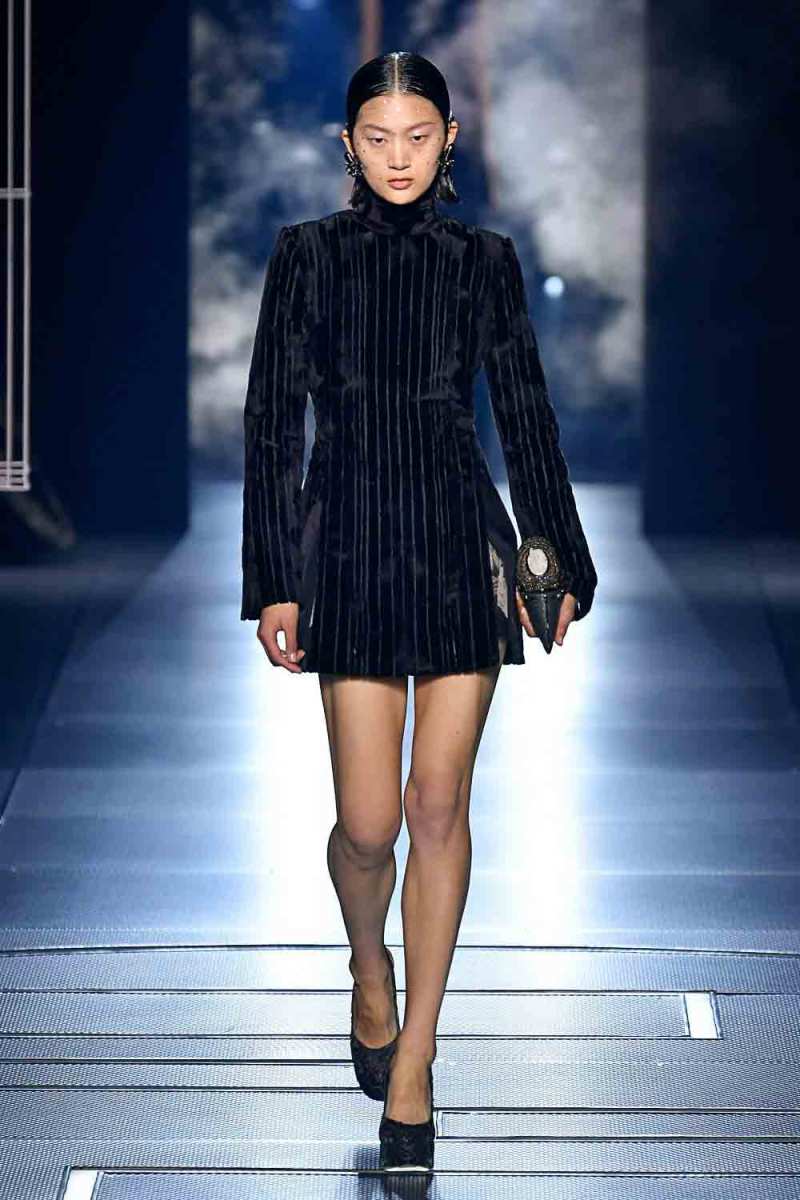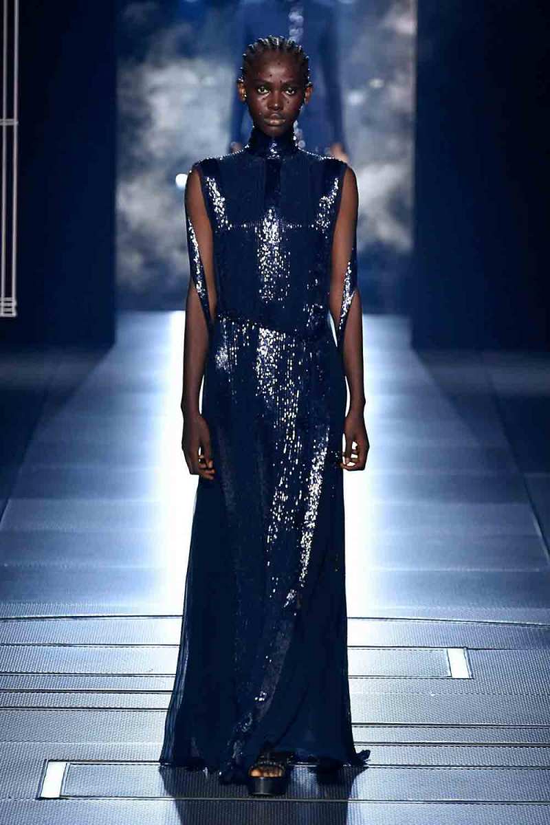 I colori tendono a essere scuri, dal nero al blu notte, con qualche tocco di rosso e di bianco. Anche le maxi stampe sui vestiti ricordano la magnificenza romana, abbinata a uno stile quasi austero con colli alti e spalle squadrate. Delfina Delettrez, l’Artistic Director Jewelry by Fendi, abbina una serie di gioielli studiati ad hoc per valorizzare la bellezza astrale della figura femminile: pietre cristalli e diamanti dai torni siderali e dalla luce potente.