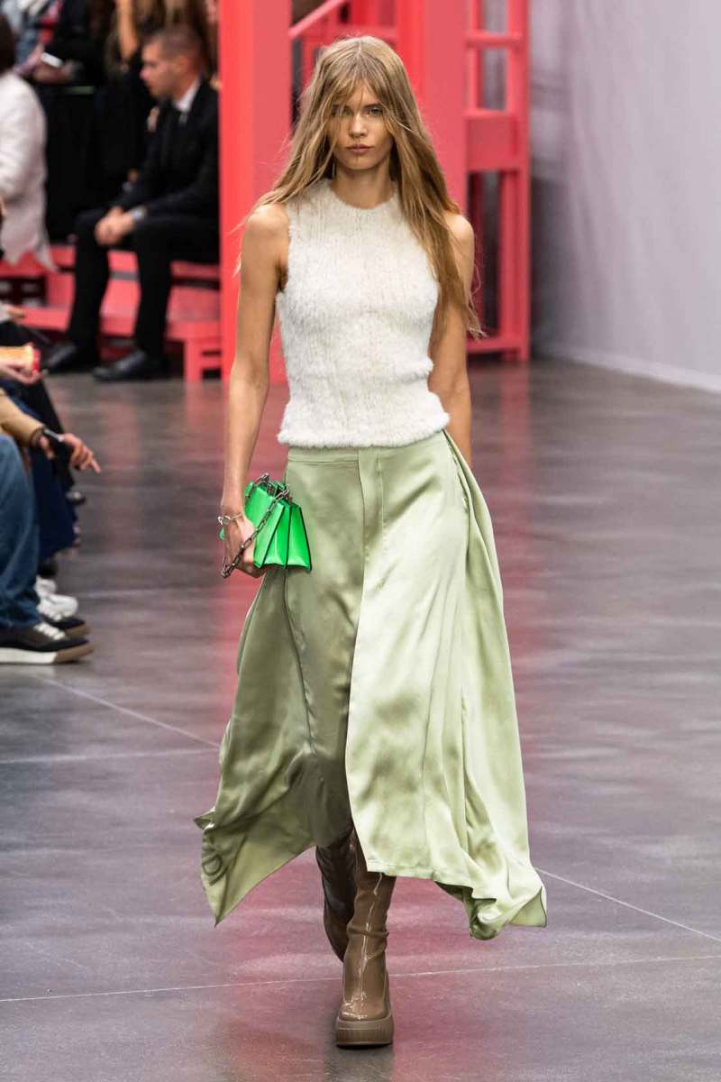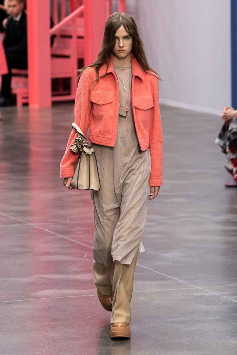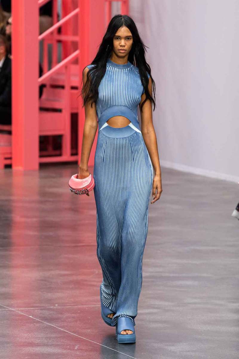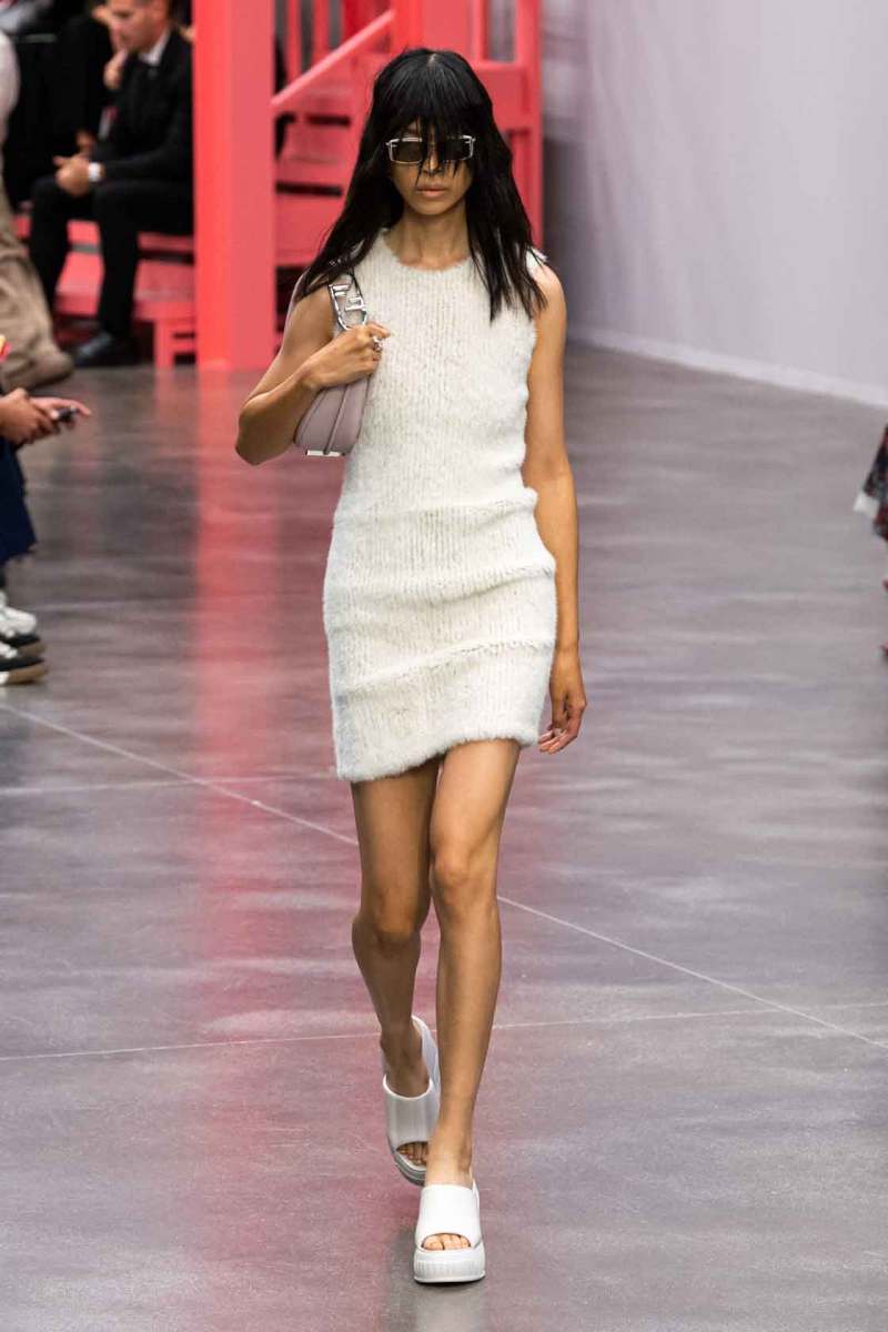 I riferimenti sono chiari: Kim Jones ha voluto riprendere i codici degli anni a cavallo tra ‘90 e 2000, quando a dirigere la Maison c’era l’iconico Karl Lagerfeld, che disegnava abiti dalle linee minimaliste. Nei look in passerella, infatti, ritroviamo l’eco dei suoi kimono, delle cinture obi e dei tablier, gli abiti-grembiule alla francese. L’omaggio all’Heritage della casa di moda romana si unisce e sovrappone però con naturalezza allo stile contemporaneo, che cavalca le nuove tendenze dettate dalla generazione Z, come i pantaloni cargo a vita bassa e lo scollo a canotta dei top.