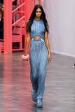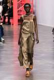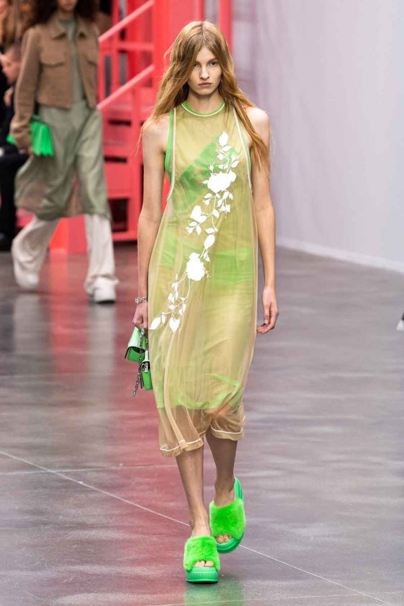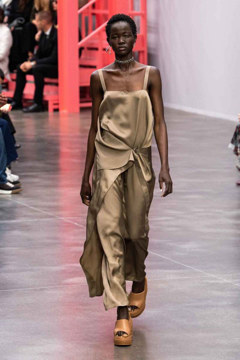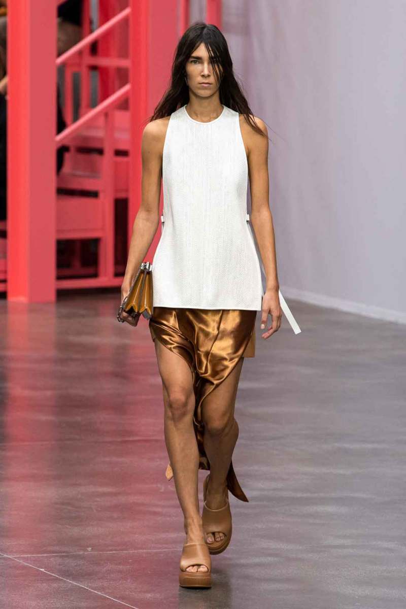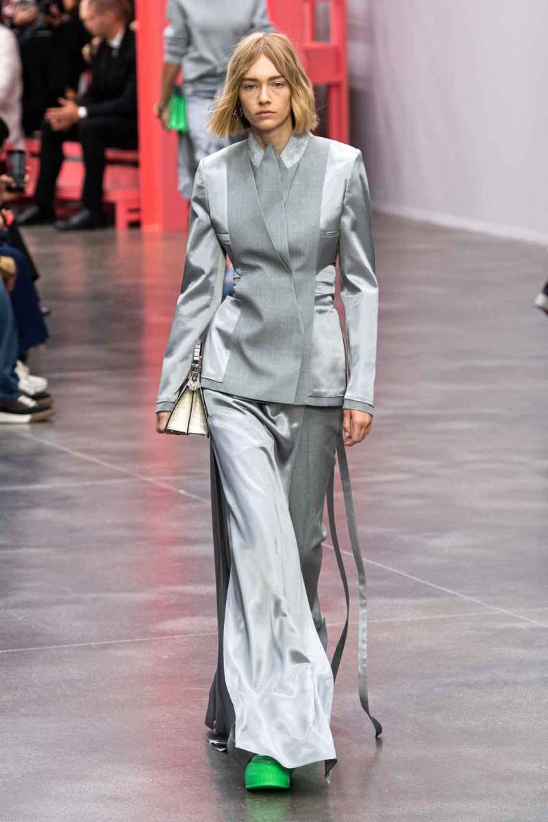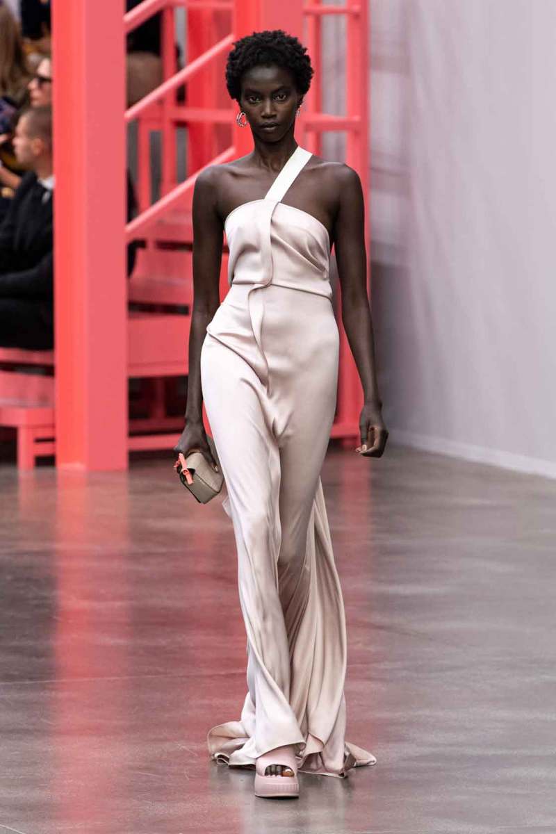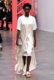 I look sono leggeri e impalpabili, fatti di abiti fluidi e lucenti, pantaloni in seta e maglie trasparenti che lasciano intravedere la lingerie. Anche i completi monocolore, con le spalle pronunciate e la vita stretta, scivolano sui corpi, leggerissimi nella loro eleganza. Kim Jones ha voluto unire lusso e praticità, puntando all’essenzialità delle linee e a materiali morbidi e leggeri, che fanno emergere tutta la raffinatezza della collezione.