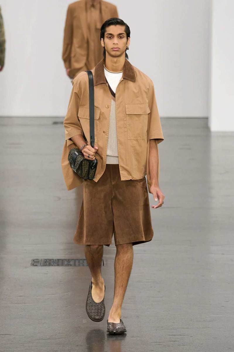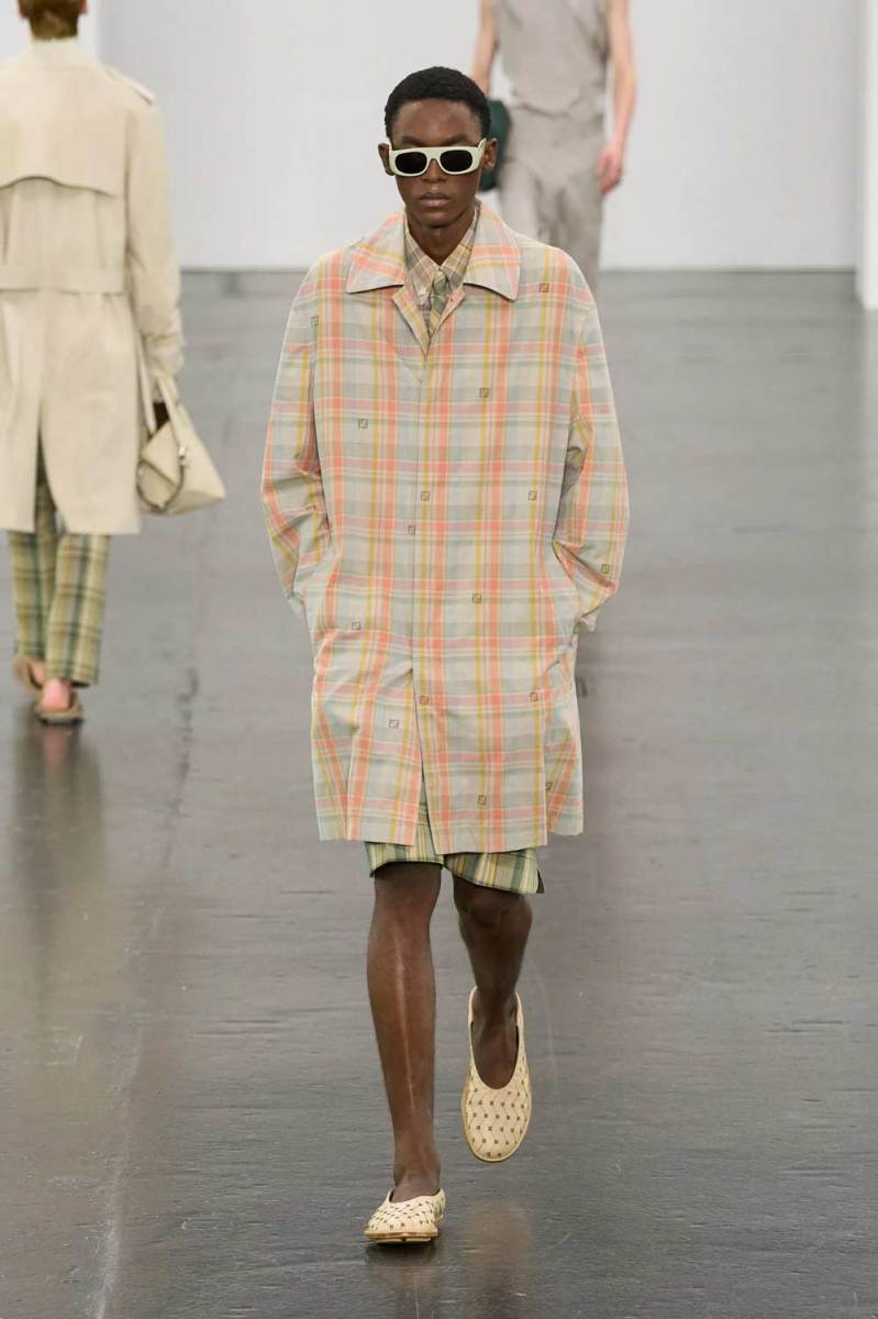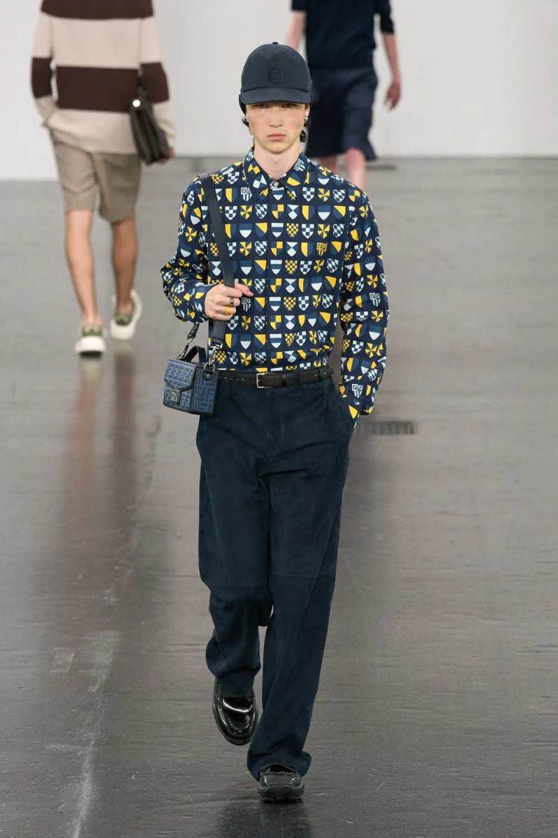 Le abbottonature asimmetriche e i dettagli modulabili sono tra gli elementi più distintivi. Camicie a maniche corte in toni pastello e polo in maglia a coste vengono rinnovate con chiusure deviate lateralmente. Lo stile preppy viene celebrato con maglie a scollo a V, camicie con emblemi logati Fendi, blazer con bottoni metallici e capi in tartan neutri, rivisitati con freschezza e attitudine.