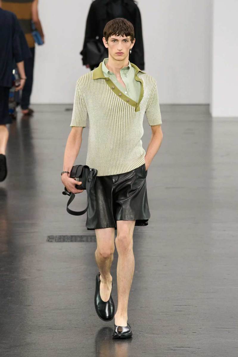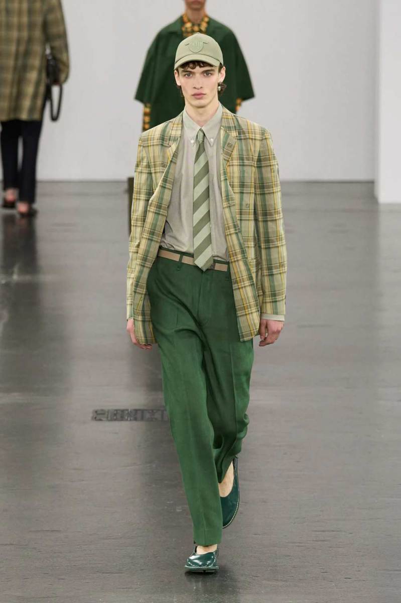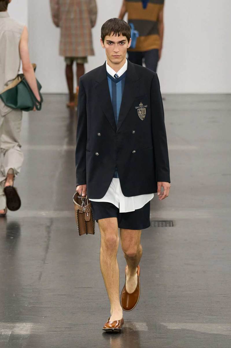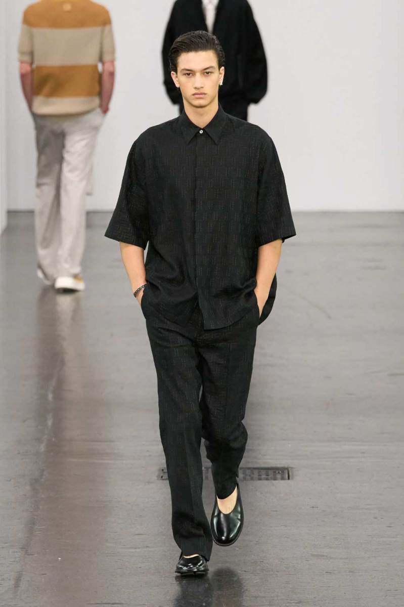 Le abbottonature asimmetriche e i dettagli modulabili sono tra gli elementi più distintivi. Camicie a maniche corte in toni pastello e polo in maglia a coste vengono rinnovate con chiusure deviate lateralmente. Lo stile preppy viene celebrato con maglie a scollo a V, camicie con emblemi logati Fendi, blazer con bottoni metallici e capi in tartan neutri, rivisitati con freschezza e attitudine.