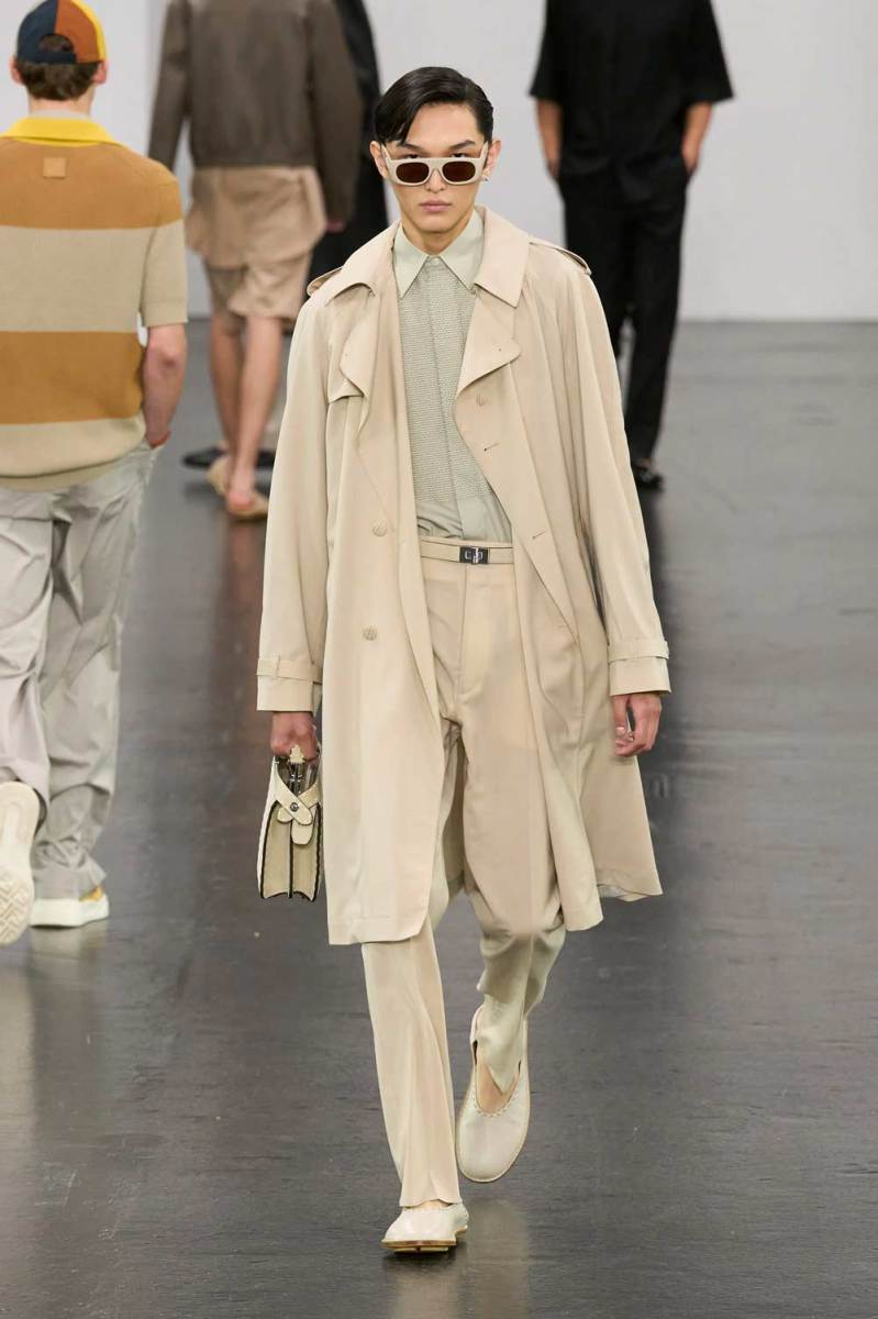 Le linee classiche e rigorose dell’uomo Fendi si arricchiscono di dettagli nuovi e sofisticati nella collezione Primavera/Estate 2025. Quest’anno, celebrando il centenario di Fendi, Silvia Venturini Fendi rinnova l’estetica minimale del marchio con un tocco moderno. Abbiamo dettagli modulari come abbottonature asimmetriche, zip nascoste nei pantaloni trasformabili in bermuda e maniche doppie per diverse modalità di vestizione, tutti integrati in uno stile preppy reinterpretato.
