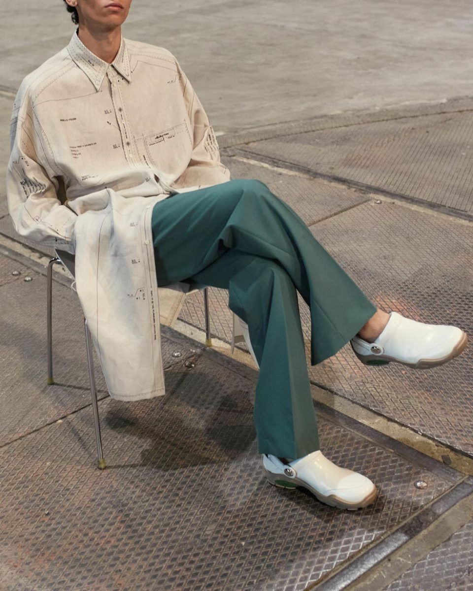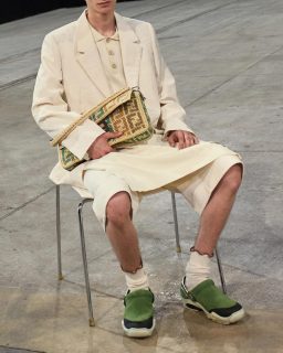 La linea di demarcazione fra creatori e creazioni è definitivamente scavalcata quando i modelli scendono in passerella. Sono l’archetipo dell’artigiano corporate, con tanto di grembiuli da lavoro usati per creare giochi di sovrapposizioni su camicie con colletto all’americana, pantaloni sartoriali e shorts da città. Le proporzioni non convenzionali tornano anche su canotte a costine rimpicciolite e pantaloni da completo a vita alta alternati a pantaloni al ginocchio e camicie lunghe abbottonate fino al gomito. Molti dei look sono punteggiati da cinture da lavoro con i ferri del mestiere ben in vista, un rimando forte e chiaro al mondo della manifattura.