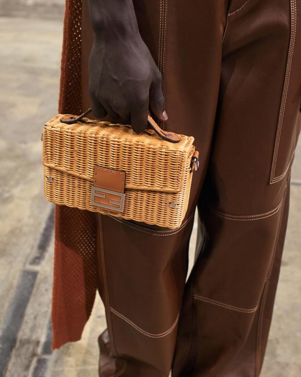 Morbidi cestini intrecciati e lunch bag jacquard sono accostate ad ampi borsoni ricamati in rafia e a valigie rigide in vivaci stampe FF, mentre modelli iconici come Baguette e Peekaboo sono re-immaginate in tessuti tinti vegetali con scaglie di pelle incisa e grafica trompe l’oeil. La novità è la tracolla minimalista Fendi Chiodo in pelle martellata, la quale condivide l’innovativa cerniera Fendi Shadow con la scarpa di stagione: lo zoccolo Fendi Lab, dotato di cinturino girevole sul tallone e suola FF sagomata in gomma a base biologica.