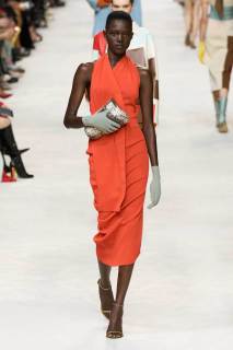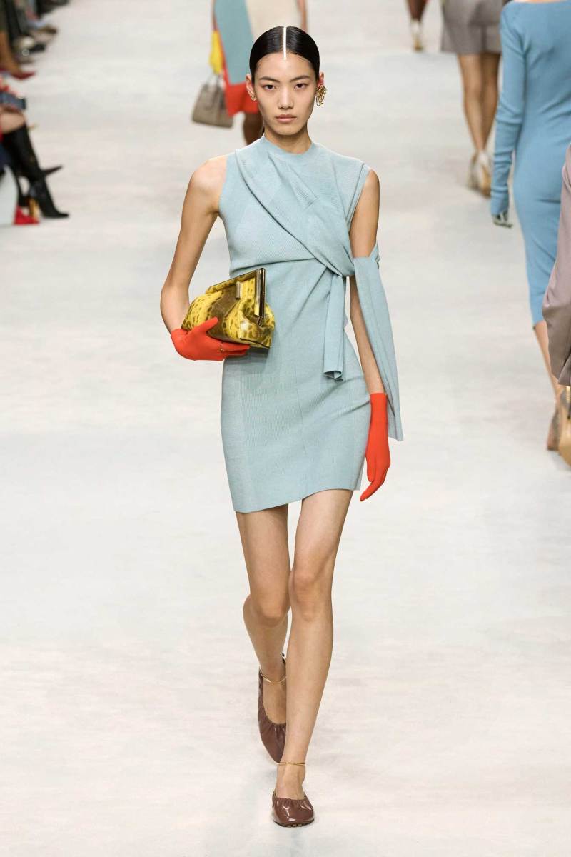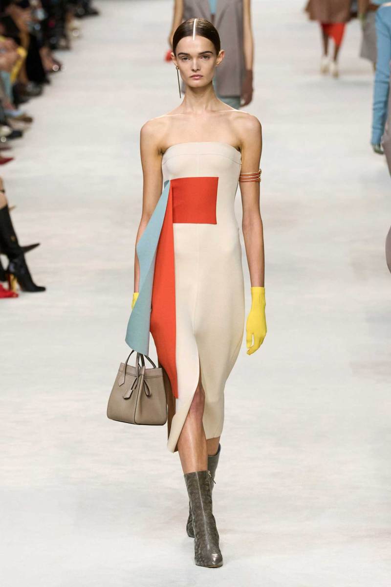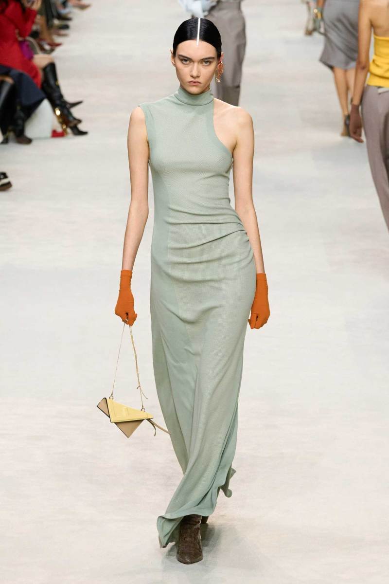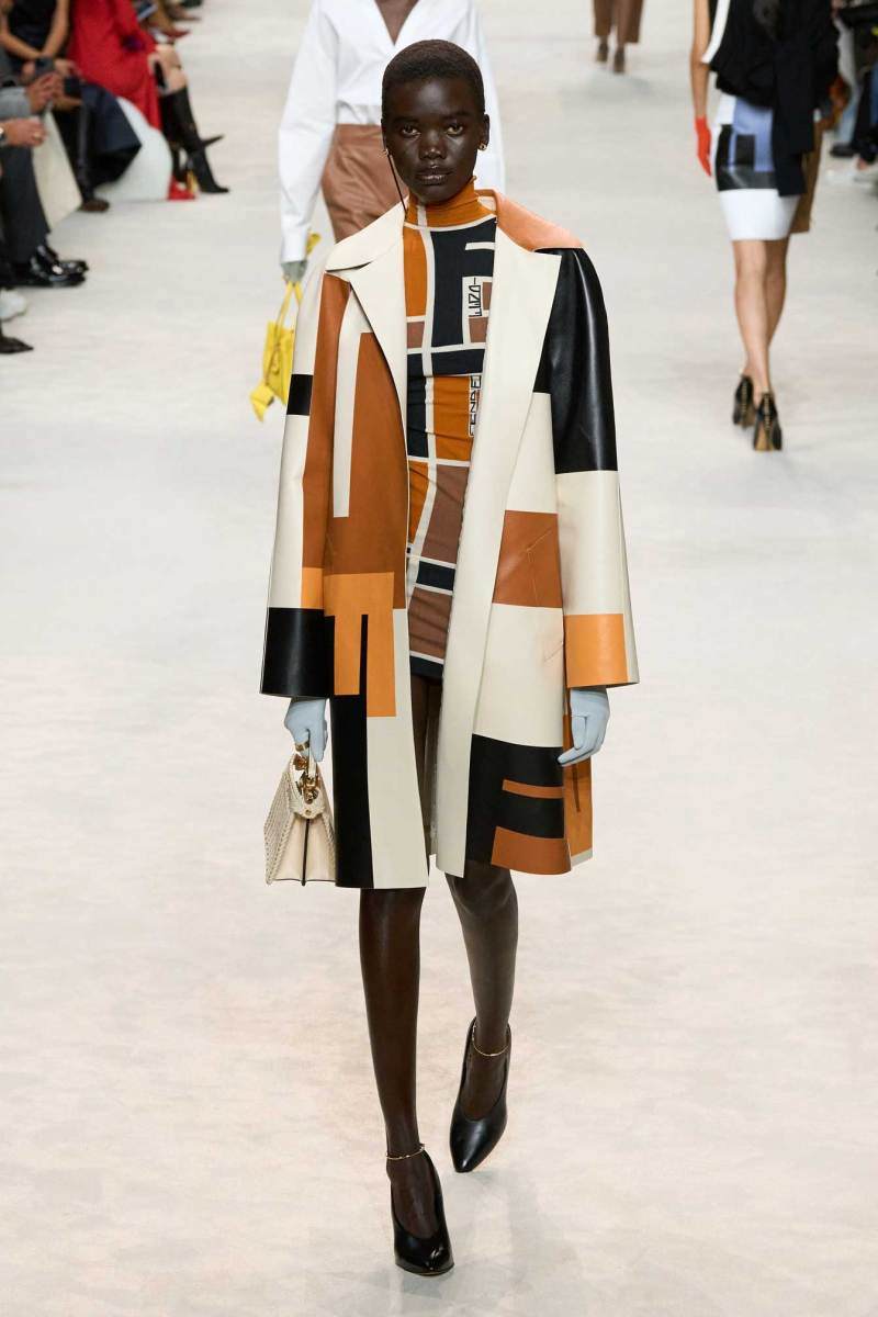 Gli anni 90 e il richiamo a Lagerfeld sono ancora presenti: si gioca sulla praticità e sull’essenzialità delle linee, ma anche sul mix di materiali e sui contrasti cromatici. Torna l’uso del maglione indossato di sbieco e legato in modo apparentemente casuale e il tanto amato layering. Un’esplorazione giocosa e astratta del logo FF si ritrova ancora una volta sia nei gioielli che nei capi di abbigliamento, dove raggiunge la sua audace apoteosi nell’astratto e colorato color-blocking FENDI, nelle pelli intarsiate e negli abiti strutturati in maglia senza spalline. Tocco di classe, i guanti seconda pelle di vari colori.
