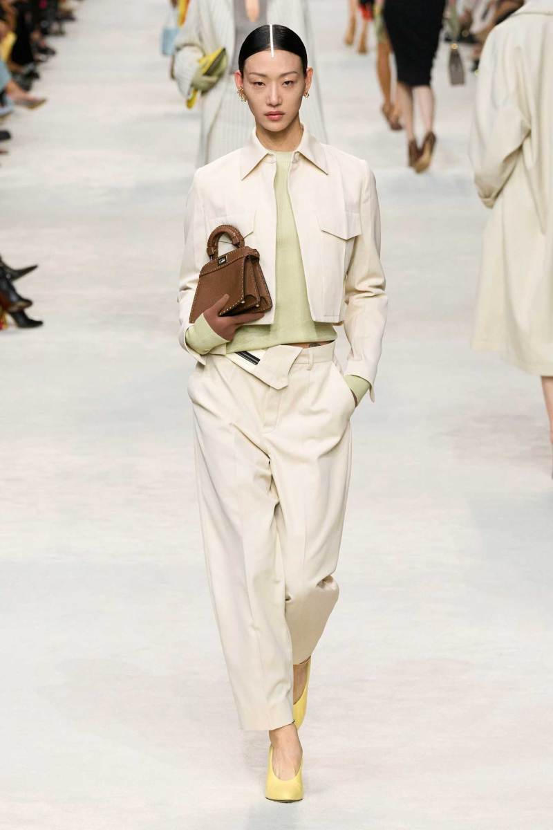 Lato accessori, Silvia Venturini Fendi non abbandona l’heritage della Maison. Le borse iconiche sono riproposte in nuove fantasie e materiali. Dalla Peekaboo alla Baguette, dalla Origami alla First. Appare però anche la new entry della stagione, in versione mini e maxi: si chiama Flip ed è una shopper che si ripiega in clutch.
