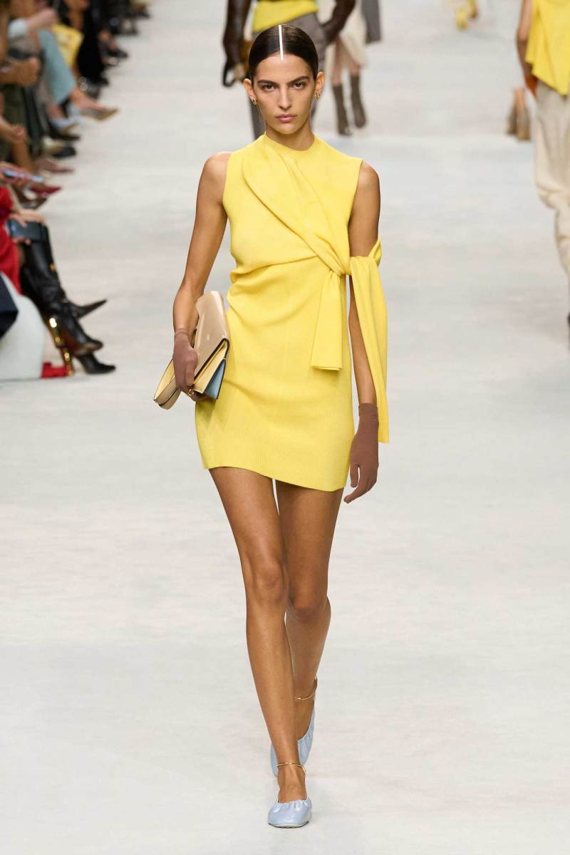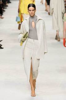 Una passerella tutta bianca, circondata da alcuni iconici accessori Fendi di dimensioni extra large, fa da sfondo alla nuova collezione Spring/Summer 2024 del marchio. La visione del direttore creativo Kim Jones parte ancora una volta dalla Capitale e dalle sue suggestioni. La nuova collezione è ispirata a “un certo spirito di libertà romano, dove l’imperfezione diventa perfezione umana e dove il lusso si ritrova nel comfort e nella tranquilla sicurezza di essere se stessi; sicurezza che gli abiti e gli accessori conferiscono a chi li indossa”.