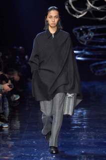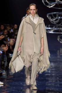 Il freddo della stagione autunno-invernale non può intimorire: must have della collezione sono cappotti, giacche, bomber, poncho e mantelli maxi e avvolgenti realizzati in tessuti pregiati come cashmere, pellami lavorati e flanella in lana Shepard che lasciano trasparire una calda sensazione di morbidezza, ribadita nei colori tenui. I motivi sono geometrici e le silhouette verticali. Numerose anche le frange, altro tema della collezione: torneranno di moda quest’anno?