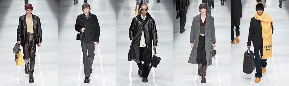 La fluidità nei codici stilistici risalta ancora di più negli accessori: catene al collo, bracciali ampi e anelli importanti ricordano i gioielli da signora, mentre al braccio appaiono maxi shopping bag, zainetti col logo della doppia F e le declinazioni maschili (ma mai troppo modificate) di Baguette e Peekaboo.