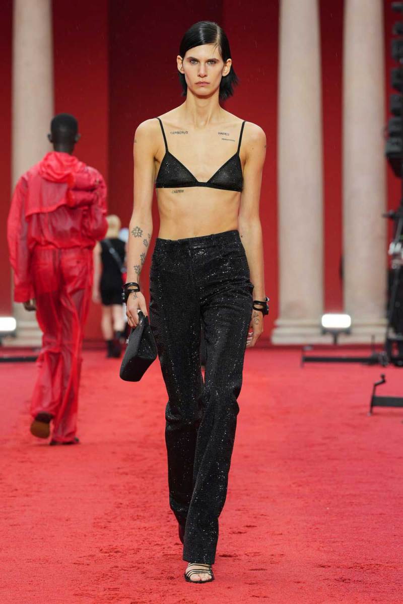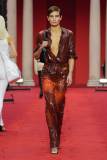 Un glamour che cambia di era in era, iniziando con abiti scintillanti coperti da cristalli, che derivano direttamente da un paio di scarpe rosse ideate e disegnate da Salvatore Ferragamo negli anni ‘50 proprio per la diva più grande del cinema hollywoodiano: Marilyn Monroe. Riferimenti anche agli anni ‘80 con completi maschili rigorosamente formali ma con quel pizzico pop tipico di quegli anni.