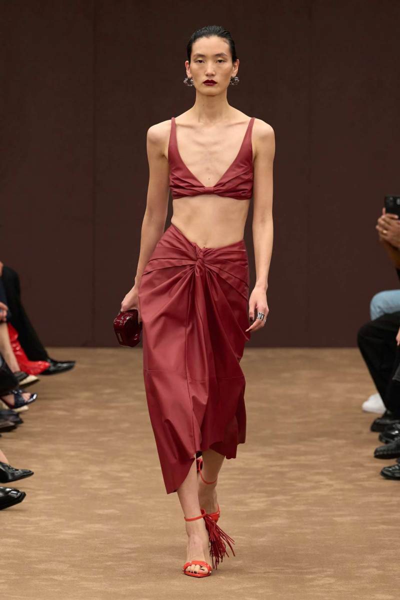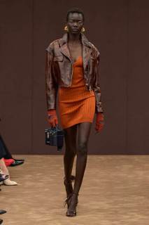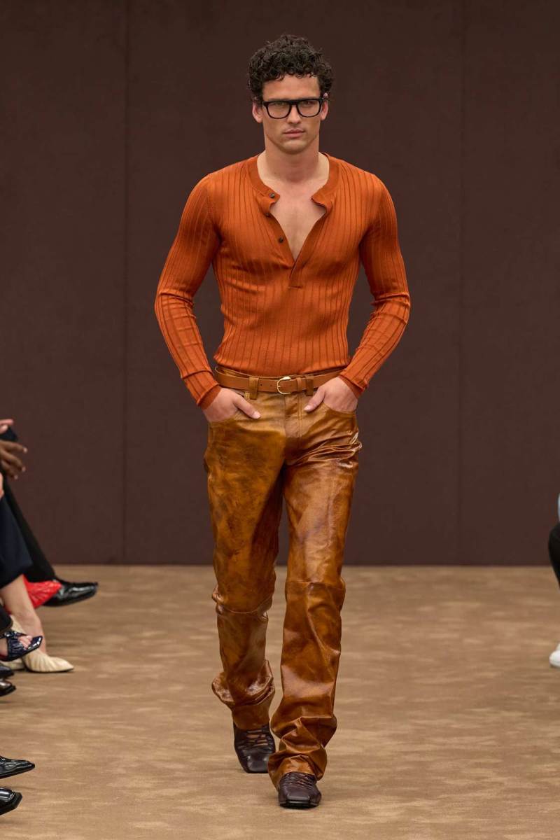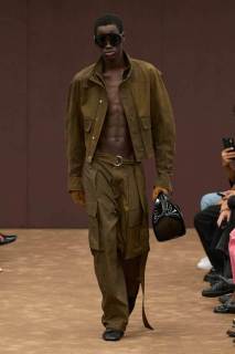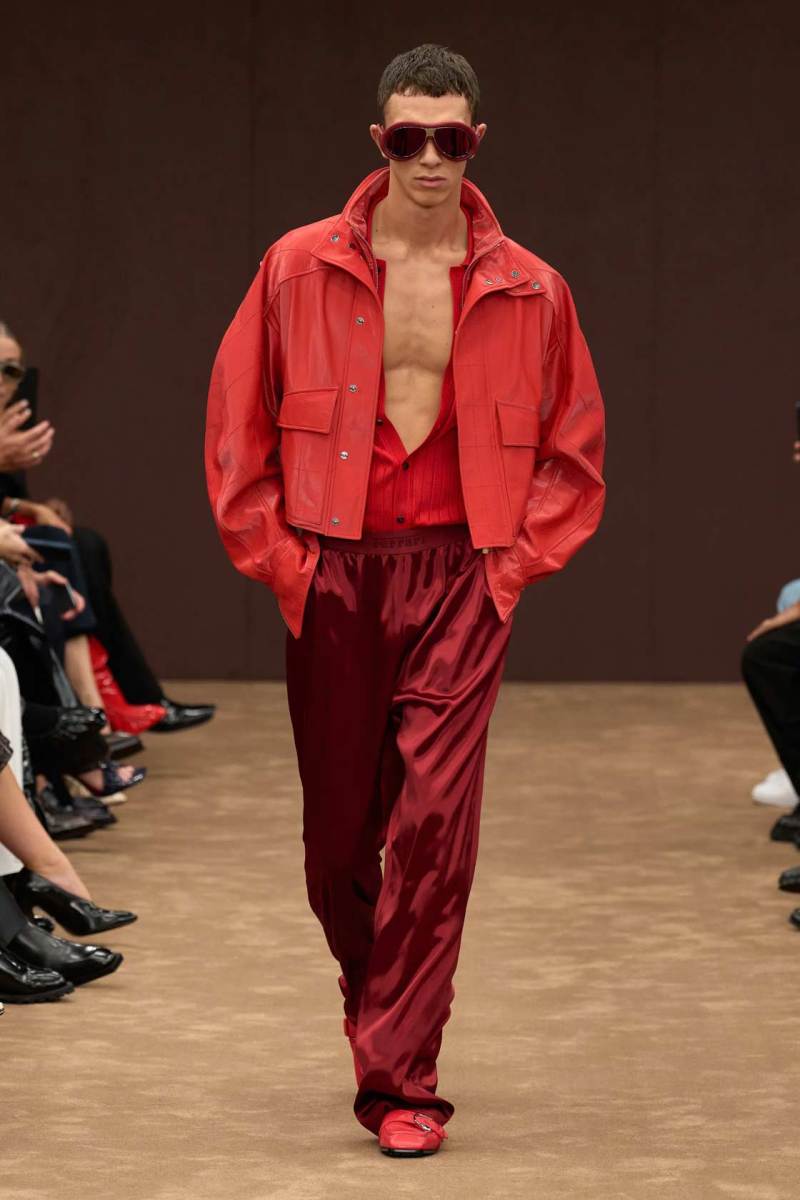 Con 33 look da donna e 18 da uomo, la collezione offre soluzioni per ogni occasione. Per le donne, spiccano abiti, blazer oversize abbinati a gonne midi, pantaloni in pelle e bralette, oltre a workwear in denim e pelle che richiamano le tute dei piloti, reinterpretate in chiave glamour. I look maschili, altrettanto ricercati, includono completi con giacche oversize, workwear in pelle e giacche cargo, fino ad arrivare a degli inaspettati pigiami in jersey, come il set composto da pantaloncino tipo boxer e maglia a maniche lunghe con scollo a V.