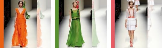 Non mancano i classici intramontabili, simbolo della maison: tessuti leggeri, quasi impalpabili pregni del suo tratto distintivo di femminilità fresca e mai volgare nonostante le trasparenze. Gioco di tessuti finissimi su abiti molto colorati dall’arancione al rosso, senza dimenticare un bellissimo verde e un altrettanto blu acceso.