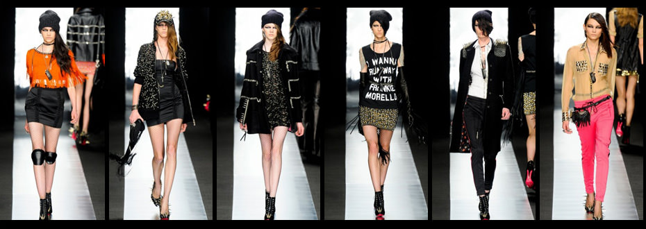 “I love rock n’ roll“. E’ una splendida replicante di Joan Jett in passerella per Frankie Morello. Così vedono e disegnano la donna per il prossimo autunno inverno Maurizio Modica e Pierfrancesco Gigliotti. Borchie, spuntoni, aculei e ancora borchie, dorate che tempestano mini giacche in pelle, minigonne e giacche smoking. Pant-skinny punk-sporty-rock e capispalla più voluminosi contraddistinguo questa giovane ribelle che vive di molto nero, ma non rinuncia a flash di arancione e rosa flou. Di sera le catene sostituiscono le borchie su abiti di raso dal taglio a sirena. La donna Frankie Morello respira glam grida: I love rock’n’roll, so come and take your time and dance with me!