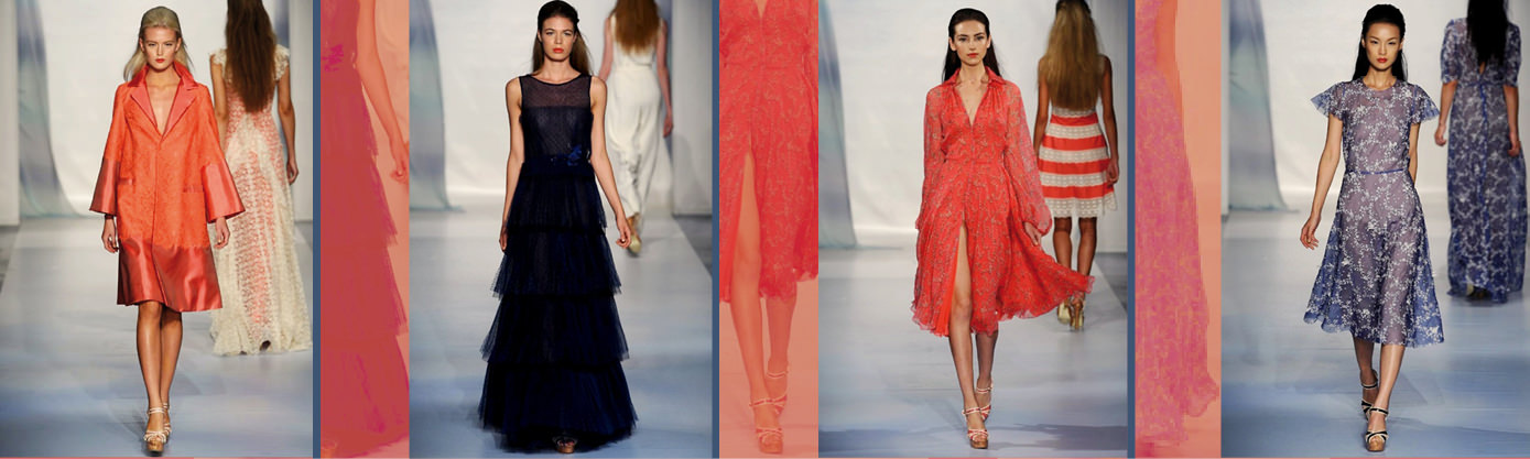 Lino intagliato, cotone tagliato a laser rendono ancor di più l’idea del 3D. Le stampe sono provenzali, fatte di micro ghirlande o angeliche e pure come le colombe. Nella palette cromatica risaltano il blu wedgwood e il rosso melograno, e si alternano e fondono con bianchi, panna, lavanda e blu navy.