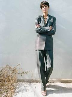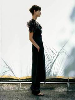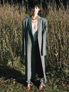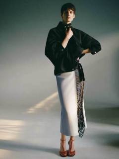 Uno degli elementi più distintivi della collezione è l’uso dei cut-out e delle aperture strategiche, soprattutto sulla schiena, che amplificano il fascino dei capi senza mai risultare eccessivi. La sensualità si esprime con eleganza, come nel cappotto di lana mohair mélange o nella gonna in pelle plongè, dove i tagli e i dettagli raffinati valorizzano la figura femminile.
