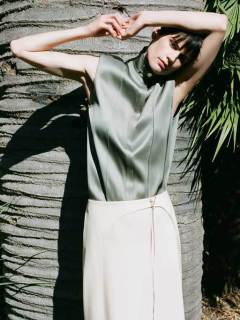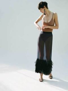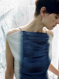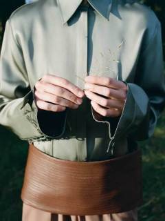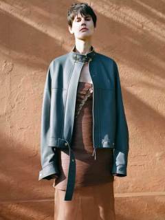I capi rivelano un’attenzione meticolosa per i dettagli, come si nota nella lavorazione della nappa, protagonista della collezione. Questa pelle, tagliata in fasce sottili e ricucita con precisione, dà vita a gonne, bomber e abiti bustier che avvolgono il corpo con una sensualità discreta. Le linee pulite e le superfici anteriori bilanciano le sofisticate lavorazioni poste sul retro, invitando a osservare i capi da ogni angolazione per apprezzarne appieno la complessità.