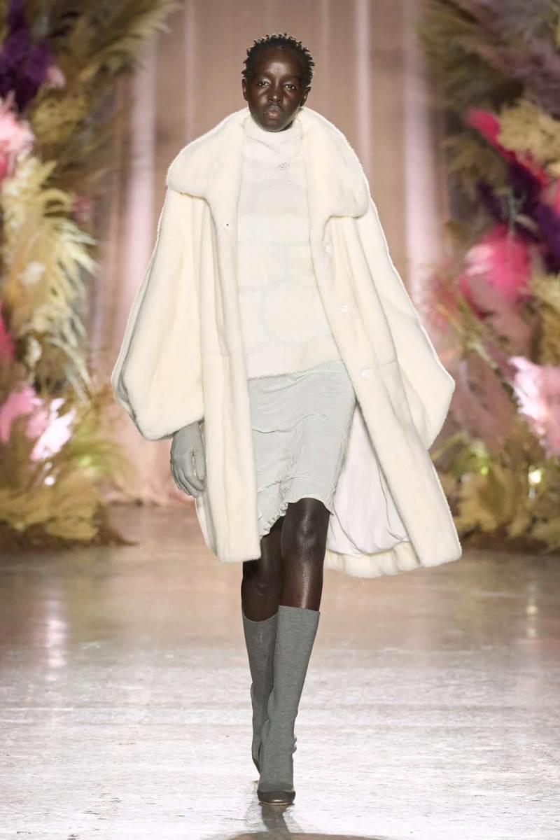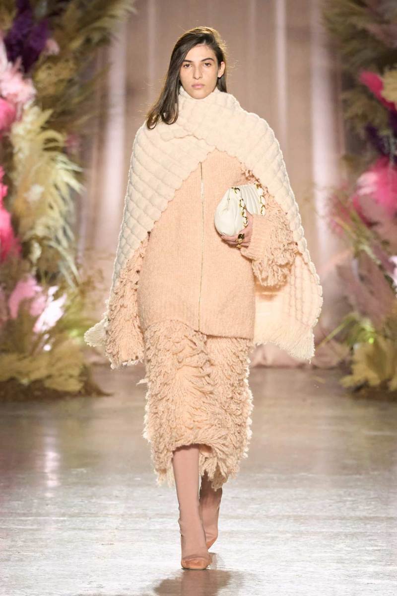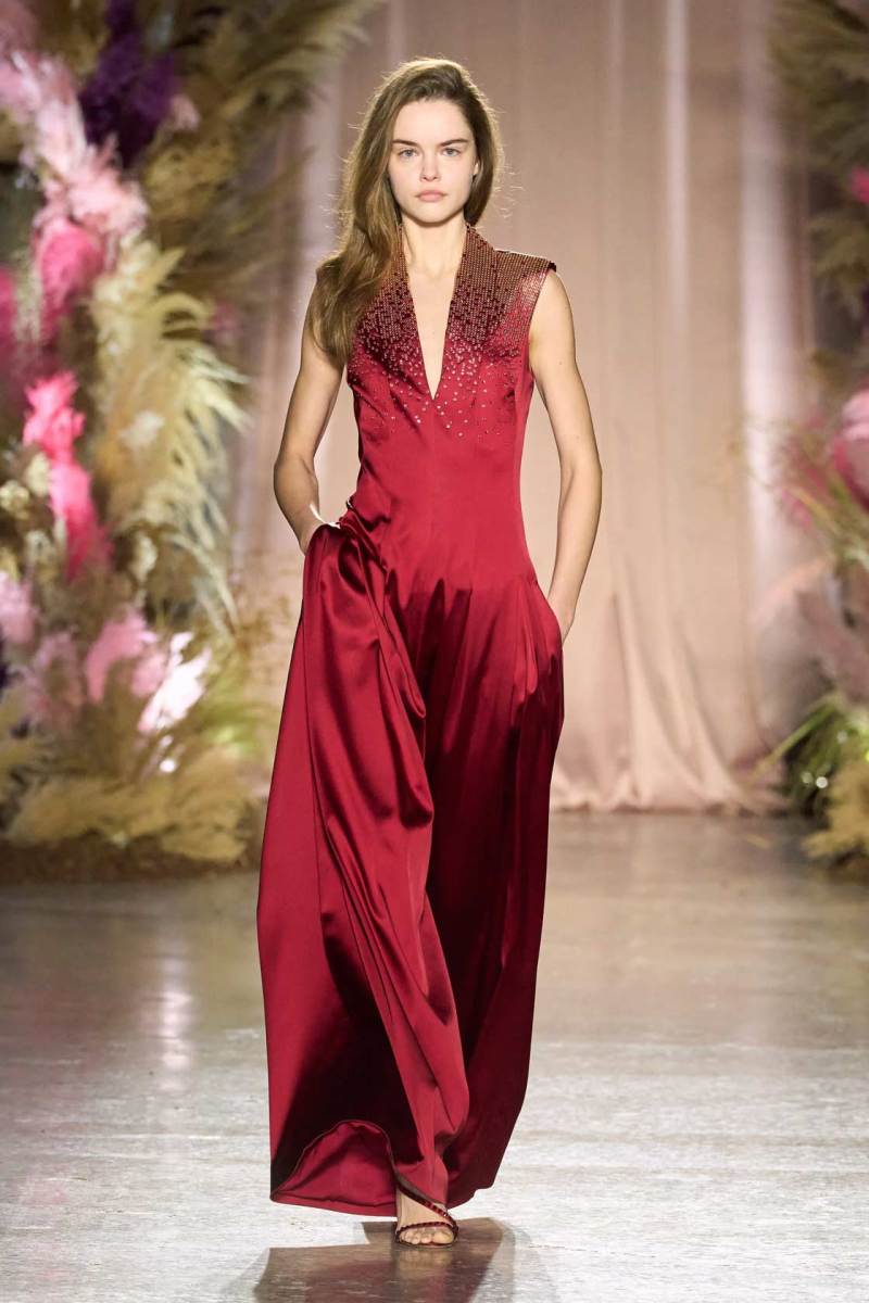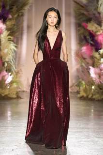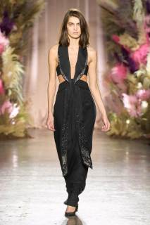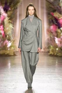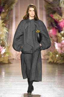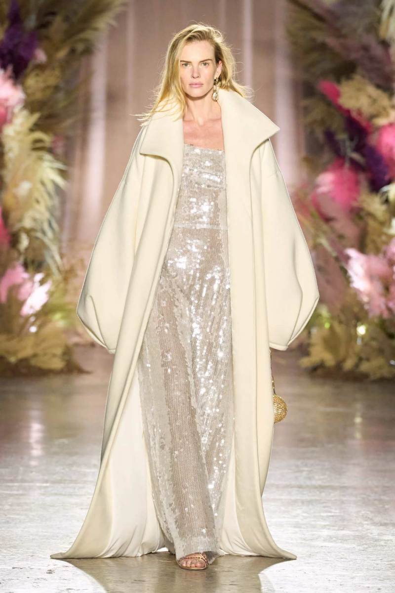 In passerella, i pantaloni ampi, le maglie in jersey, le bluse leggere, i cappotti Cocoon, le giacche con drappo e abiti da sera. A impreziosire i look, paillettes, ricami di borchie e cristalli e i sandali gioiello da abbinare alla bag tempestata di cristalli. Come calzature, anche gli stivali calzino e le décolleté Mary Jane.