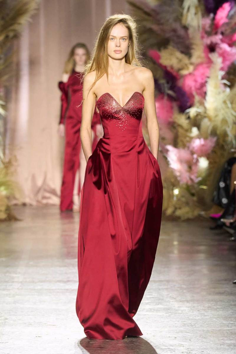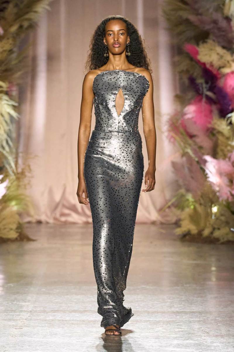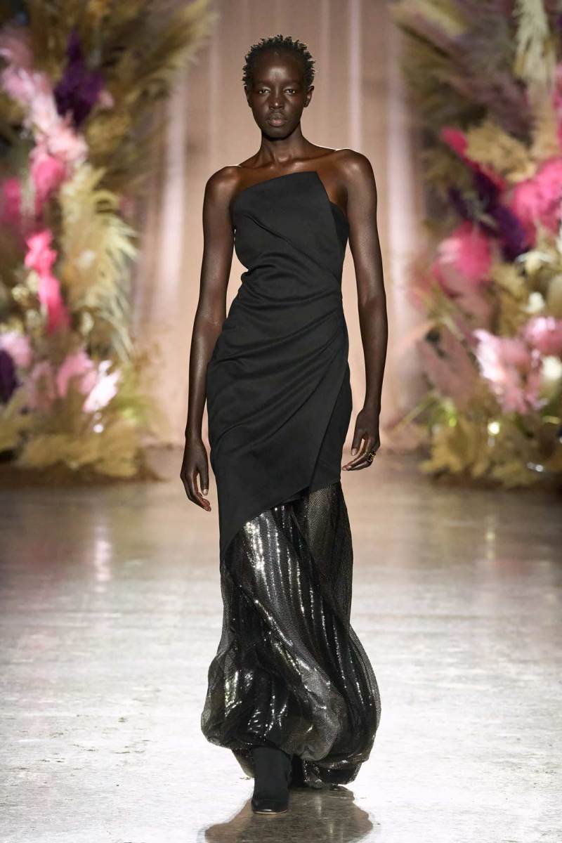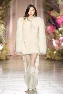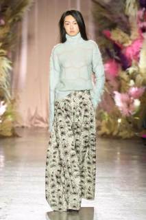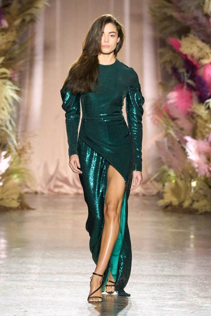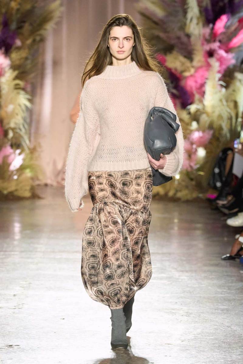 In passerella, i pantaloni ampi, le maglie in jersey, le bluse leggere, i cappotti Cocoon, le giacche con drappo e abiti da sera. A impreziosire i look, paillettes, ricami di borchie e cristalli e i sandali gioiello da abbinare alla bag tempestata di cristalli. Come calzature, anche gli stivali calzino e le décolleté Mary Jane.
