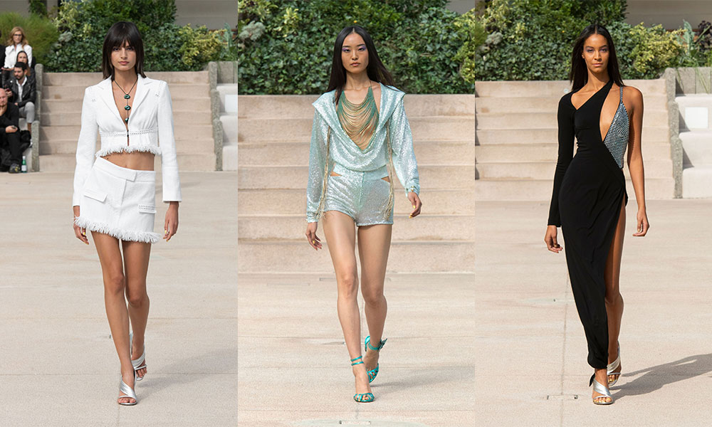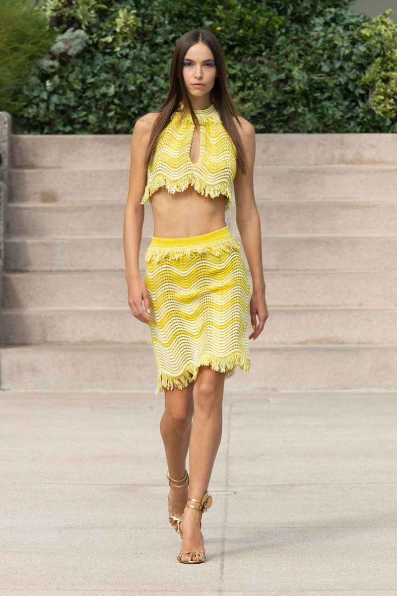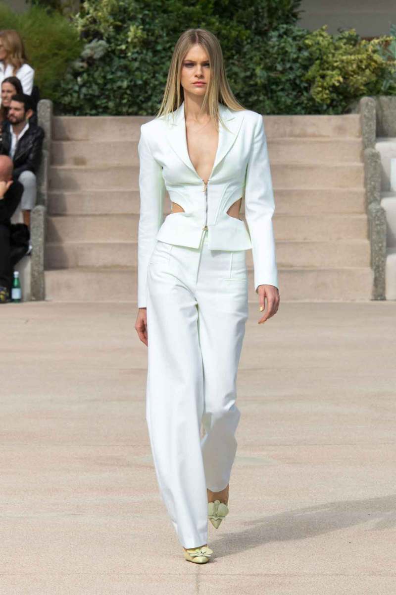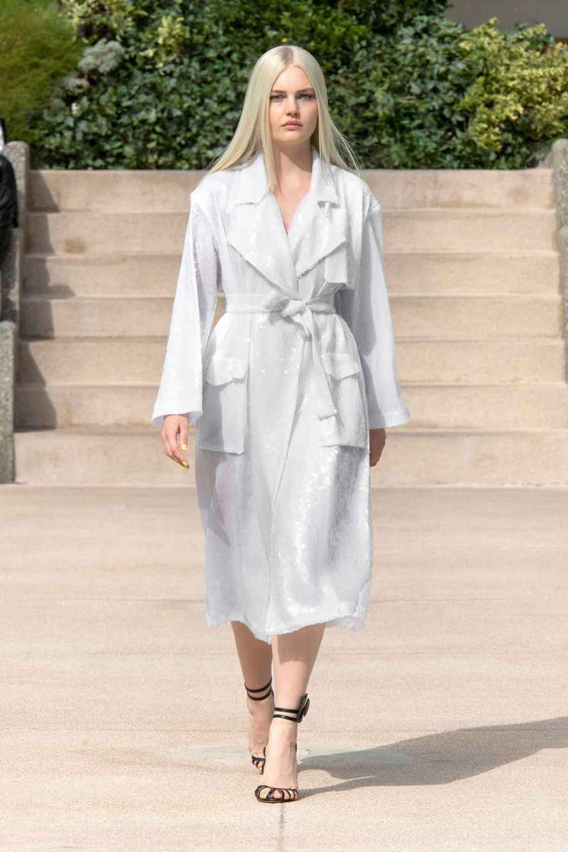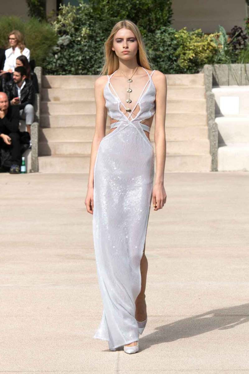 Una collezione all’insegna di una femminilità luminosa rappresentata da bluse, bustier e tailleur portati a pelle dalle modelle. Le camicie morbide e cangianti e le giacche chiuse da bottoni gioiello decorati da smalti hanno ripreso lo stile caro alla Maison. Ampio spazio a gonne midi e a long dress molto fluidi, ma anche a qualche longuette che ha esaltato i corpi con spacchi e aderenze