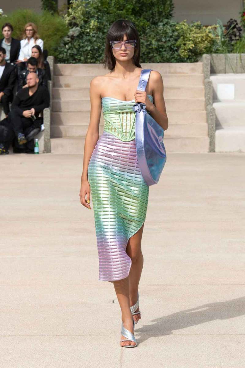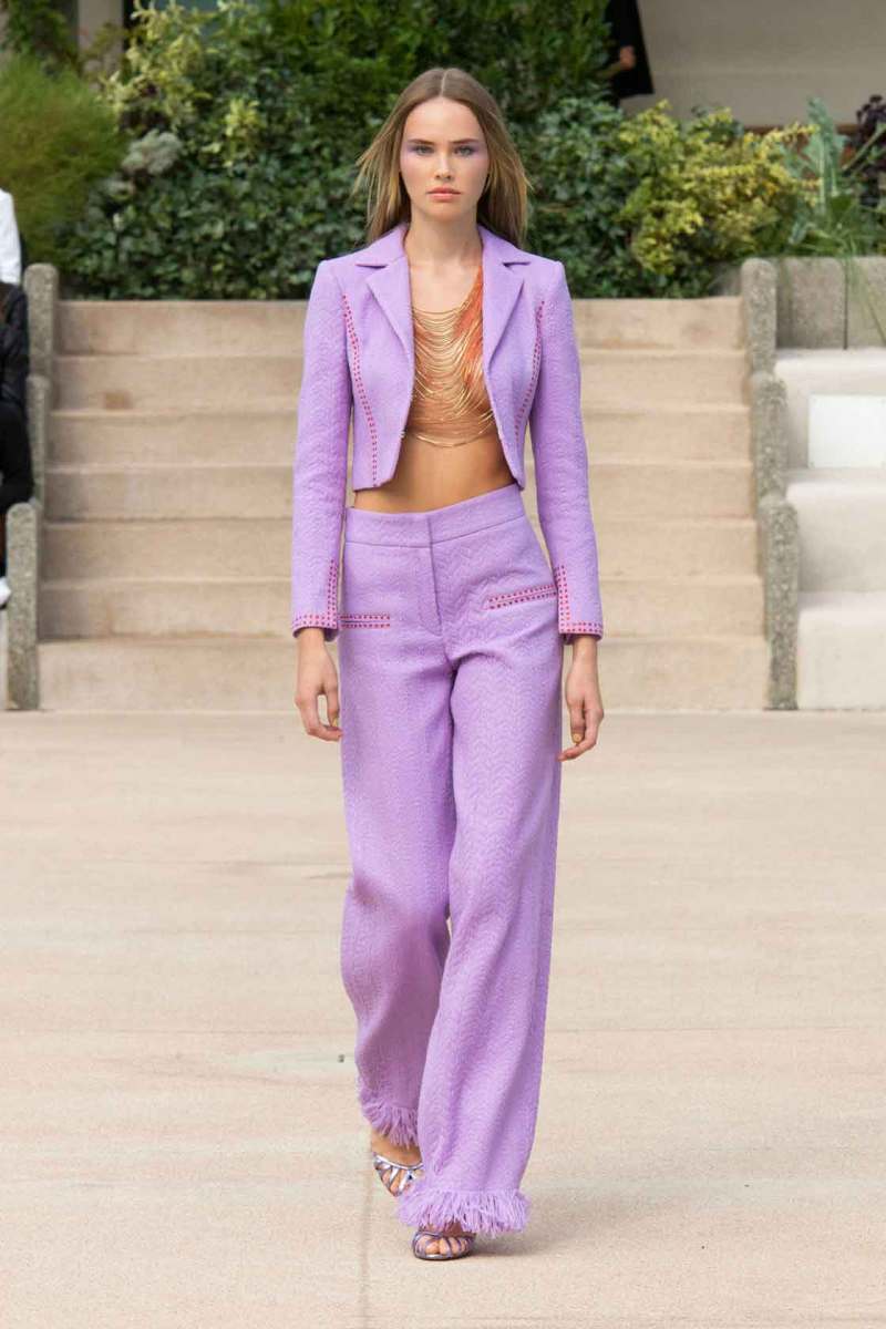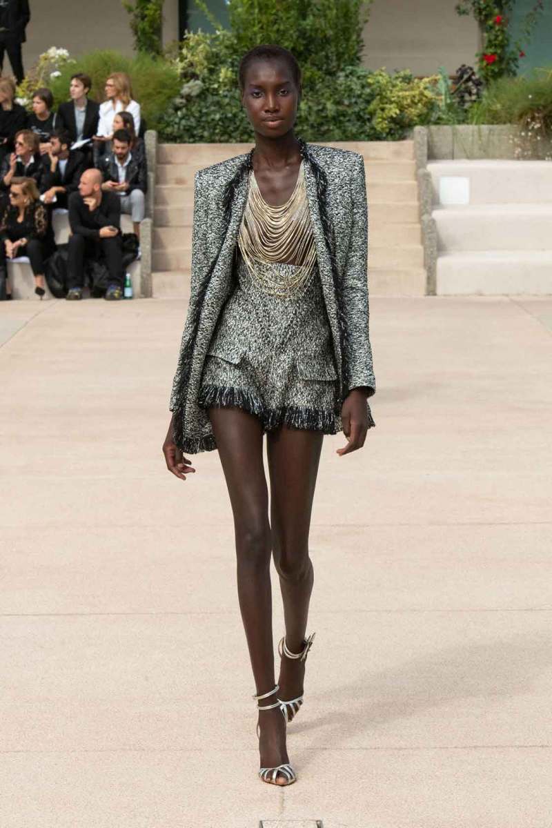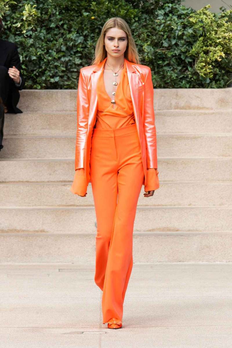 Una collezione all’insegna di una femminilità luminosa rappresentata da bluse, bustier e tailleur portati a pelle dalle modelle. Le camicie morbide e cangianti e le giacche chiuse da bottoni gioiello decorati da smalti hanno ripreso lo stile caro alla Maison. Ampio spazio a gonne midi e a long dress molto fluidi, ma anche a qualche longuette che ha esaltato i corpi con spacchi e aderenze