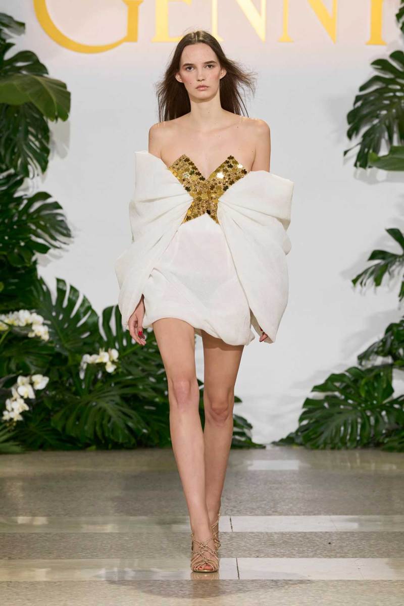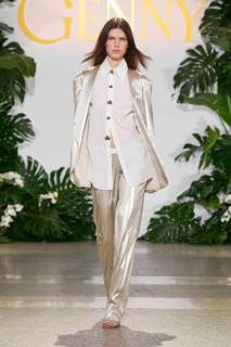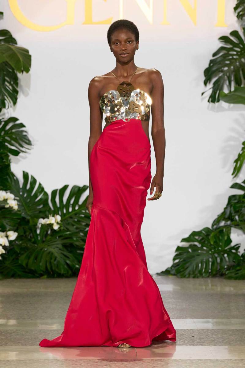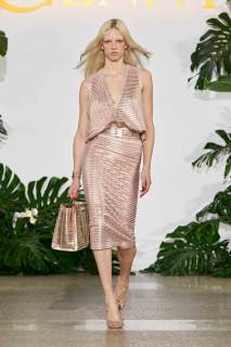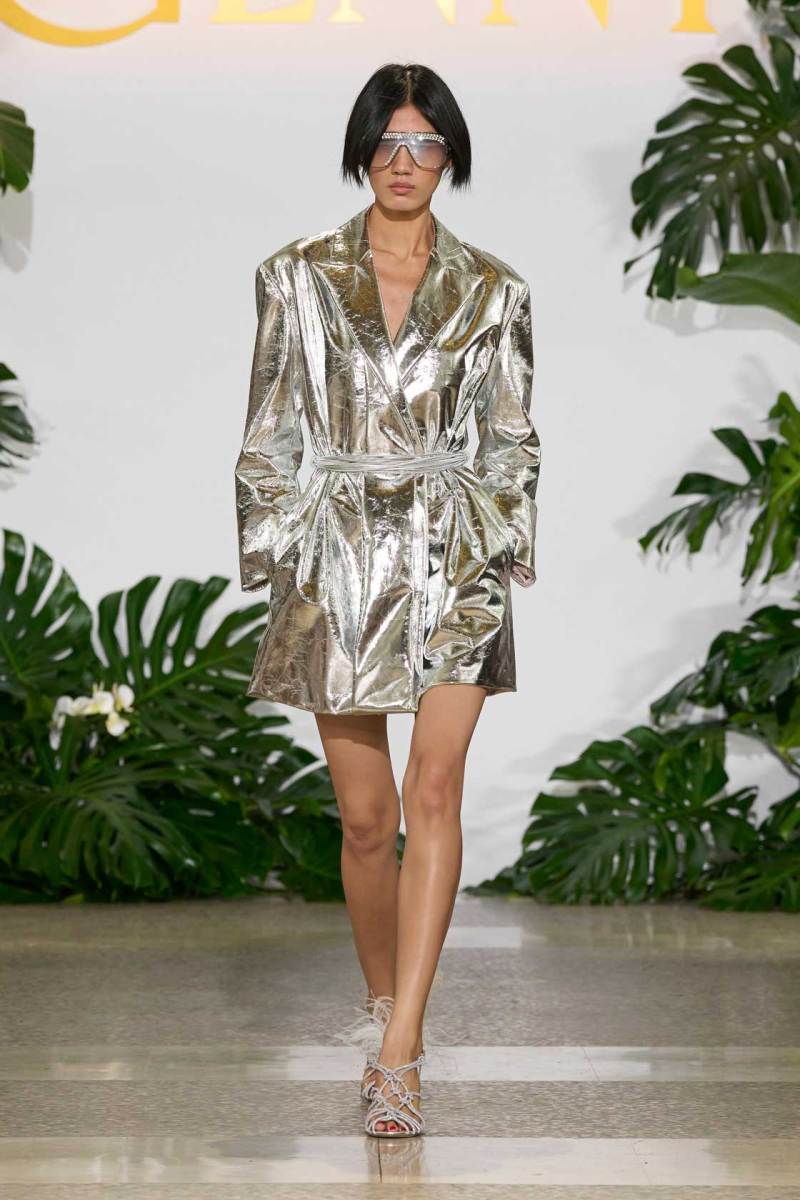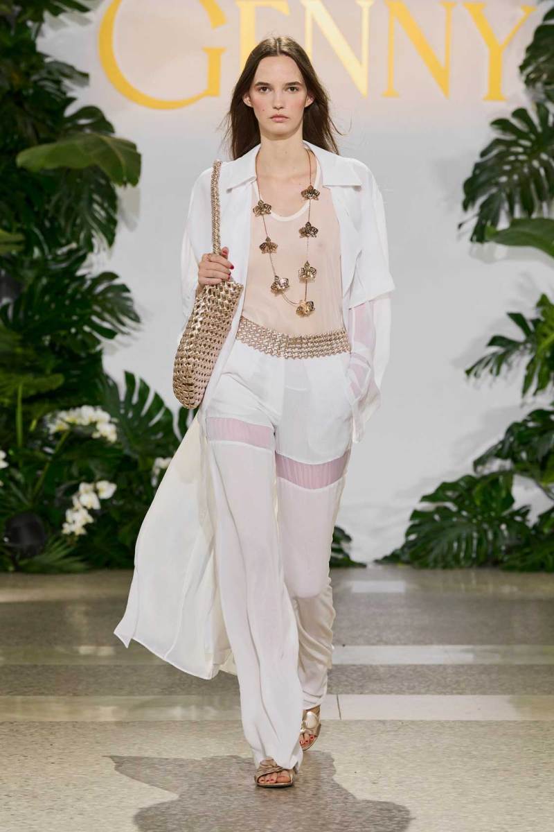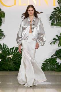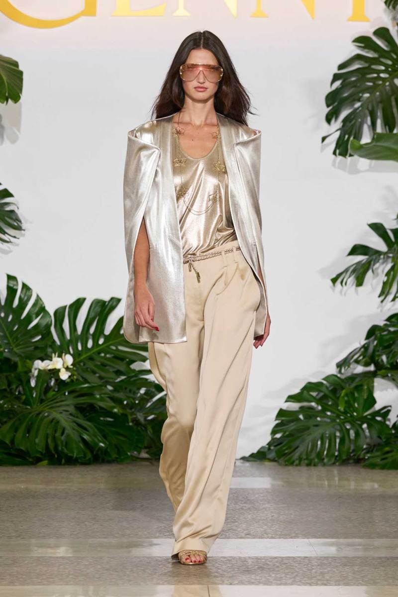 I volumi sono morbidi sul corpo, la leggerezza del bianco e dei tessuti preziosi quali chiffon, seta e lino sono in contrasto con i metalli preziosi quali oro giallo e rosa. In passerella, gonne lunghe con dettagli cut-out, abiti e pantaloni dall’effetto vedo non vedo, morbidi pantaloni sartoriali e camicie con rouche. Un tocco molto glamour è quello metallizzato, in oro e in argento, che ricopre capispalla oversize e i dettagli sulle scollature. A chiudere il défilé, una pennellata di colore rosso acceso, vibrante e grintoso.