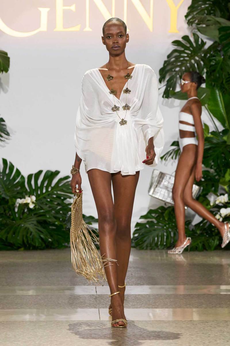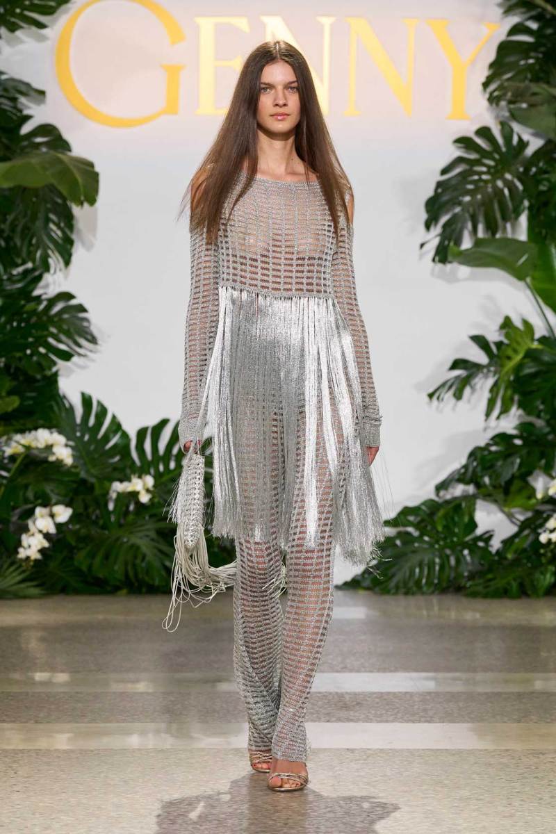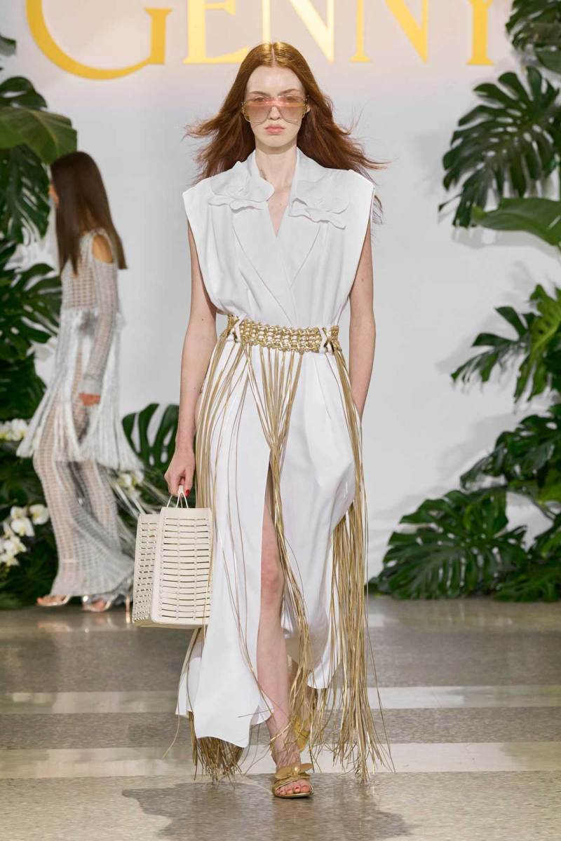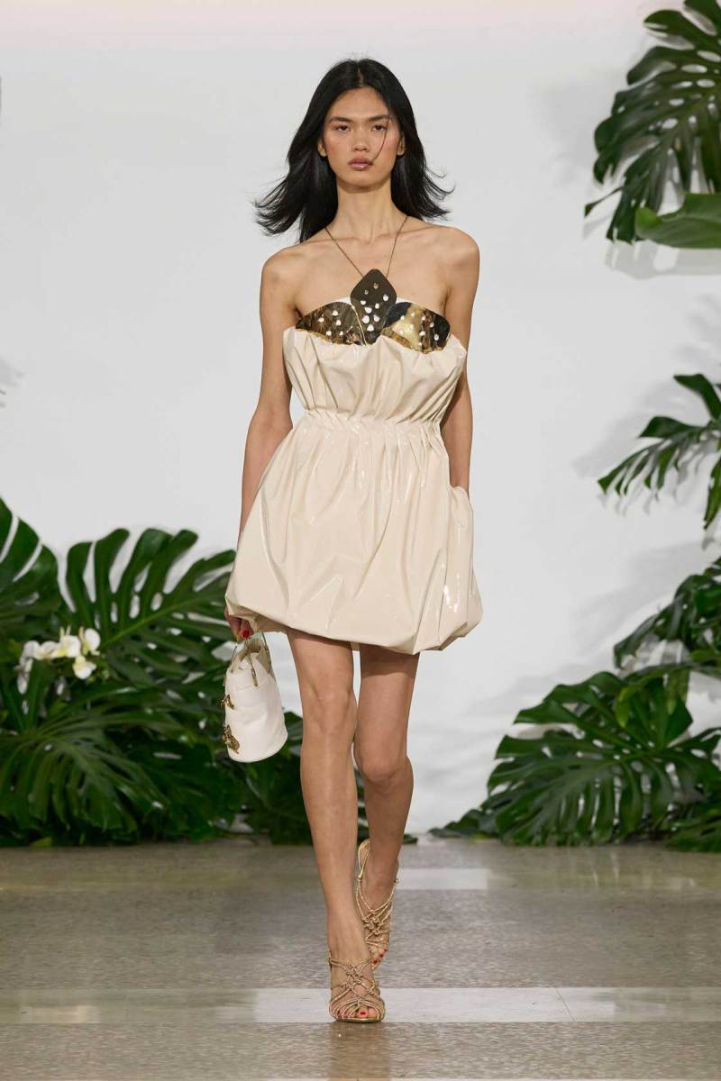 I volumi sono morbidi sul corpo, la leggerezza del bianco e dei tessuti preziosi quali chiffon, seta e lino sono in contrasto con i metalli preziosi quali oro giallo e rosa. In passerella, gonne lunghe con dettagli cut-out, abiti e pantaloni dall’effetto vedo non vedo, morbidi pantaloni sartoriali e camicie con rouche. Un tocco molto glamour è quello metallizzato, in oro e in argento, che ricopre capispalla oversize e i dettagli sulle scollature. A chiudere il défilé, una pennellata di colore rosso acceso, vibrante e grintoso.