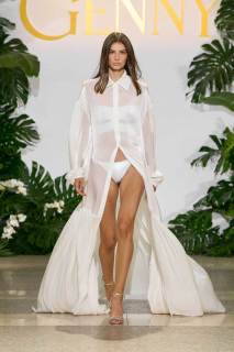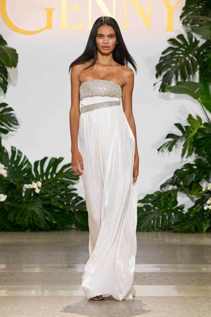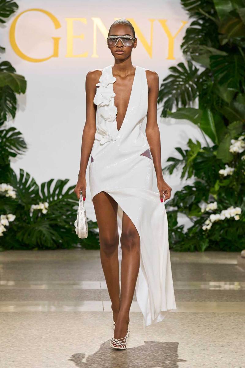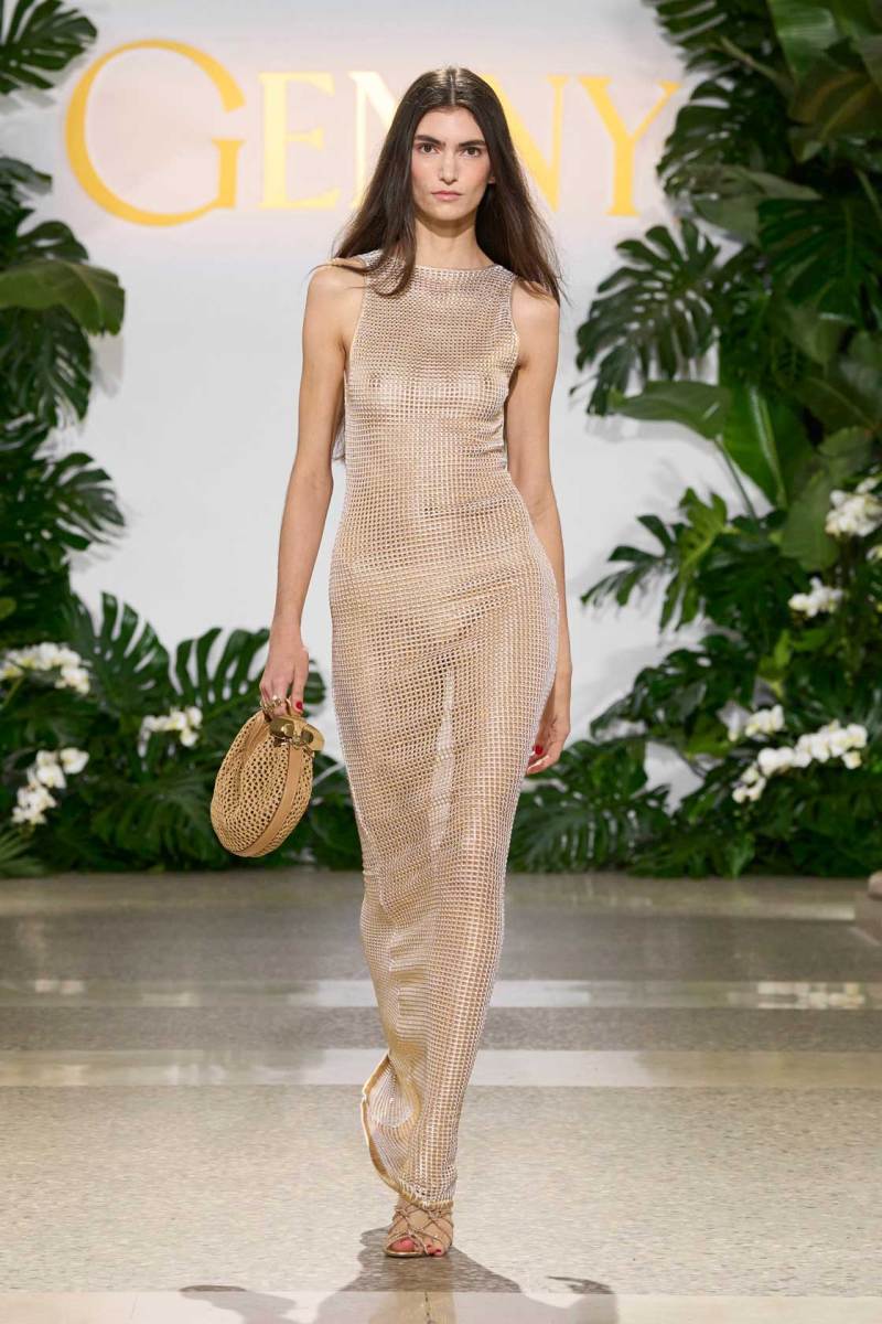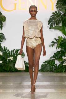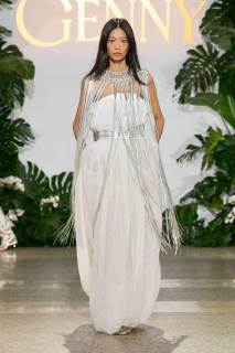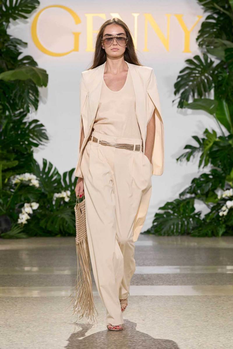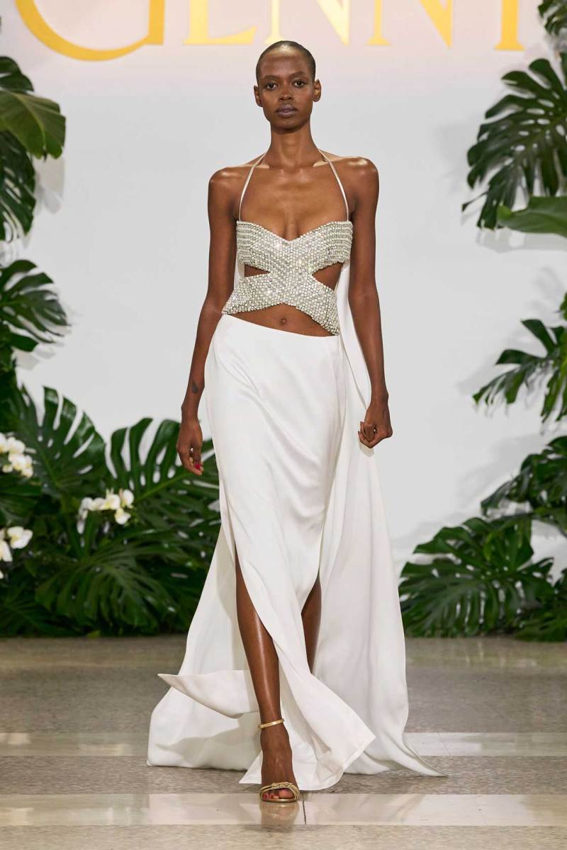 I volumi sono morbidi sul corpo, la leggerezza del bianco e dei tessuti preziosi quali chiffon, seta e lino sono in contrasto con i metalli preziosi quali oro giallo e rosa. In passerella, gonne lunghe con dettagli cut-out, abiti e pantaloni dall’effetto vedo non vedo, morbidi pantaloni sartoriali e camicie con rouche. Un tocco molto glamour è quello metallizzato, in oro e in argento, che ricopre capispalla oversize e i dettagli sulle scollature. A chiudere il défilé, una pennellata di colore rosso acceso, vibrante e grintoso.