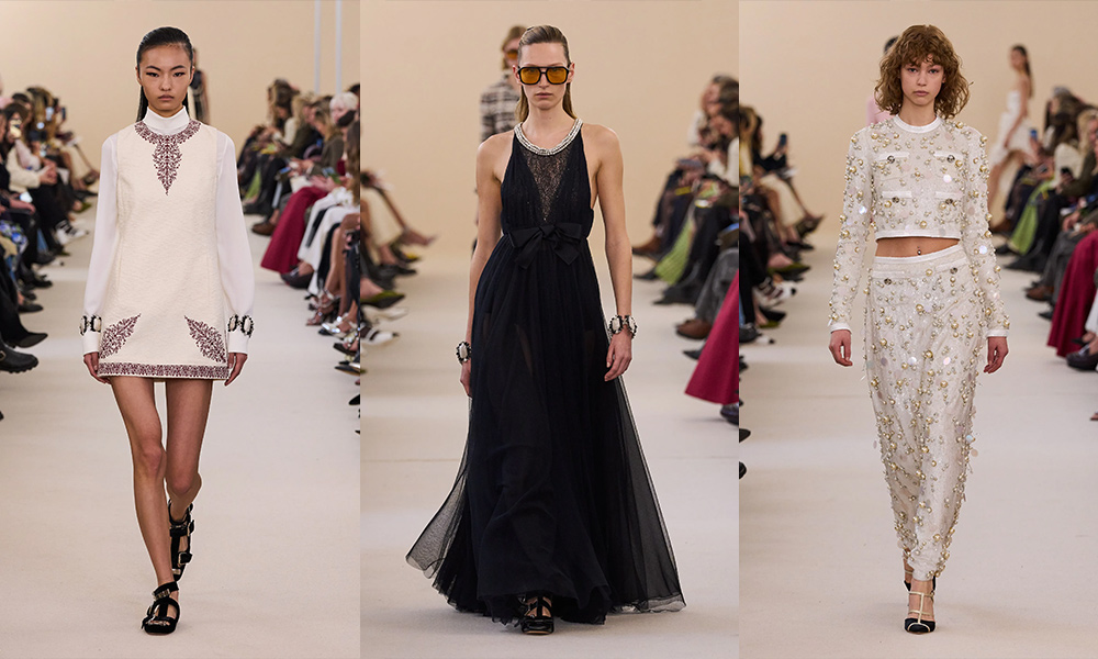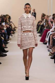 I look in passerella: tra i grandi protagonisti, abiti corti, tuniche lunghe fino ai piedi, cappotti extra lunghi, abiti ad A, cappotti, impermeabili, tea dress, abiti in georgette di seta impreziositi da volants, tailleur bouclé color senape; poi ancora tubini, tute, gonne dritte. Tutti i look vengono arricchiti da cristalli, applicazioni scintillanti e paillettes. Come calzature, sabot rock e ballerine, e tra gli altri accessori, bracciali, borse a mano, occhiali da sole, collier e cristalli onnipresenti sui capi proposti. Ai tocchi di rosa tenue e rosa baby si accostano capi più grintosi argentati in paillettes. La donna di Giambattista Valli esprime un’eleganza timeless.