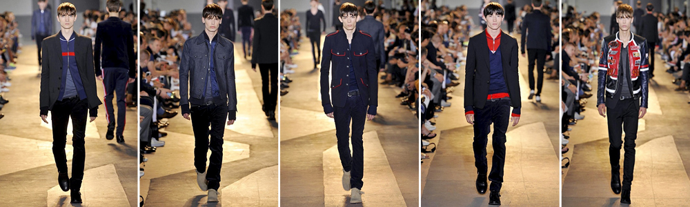 Cappotti e capi spalla sono proposti in fresco di lana, velluto da smoking o a coste micro; il denim indigo è accoppiato alla pelle mentre top sportivi a righe e t-shirts con effetto melange dall’aspetto vissuto sono indossati con disinvoltura insieme a giacche a spalle strette e pantaloni da tuta dal taglio rilassato.