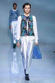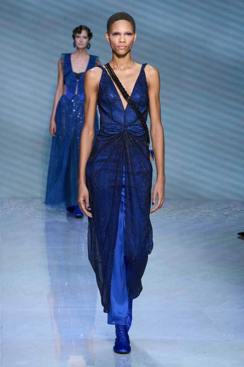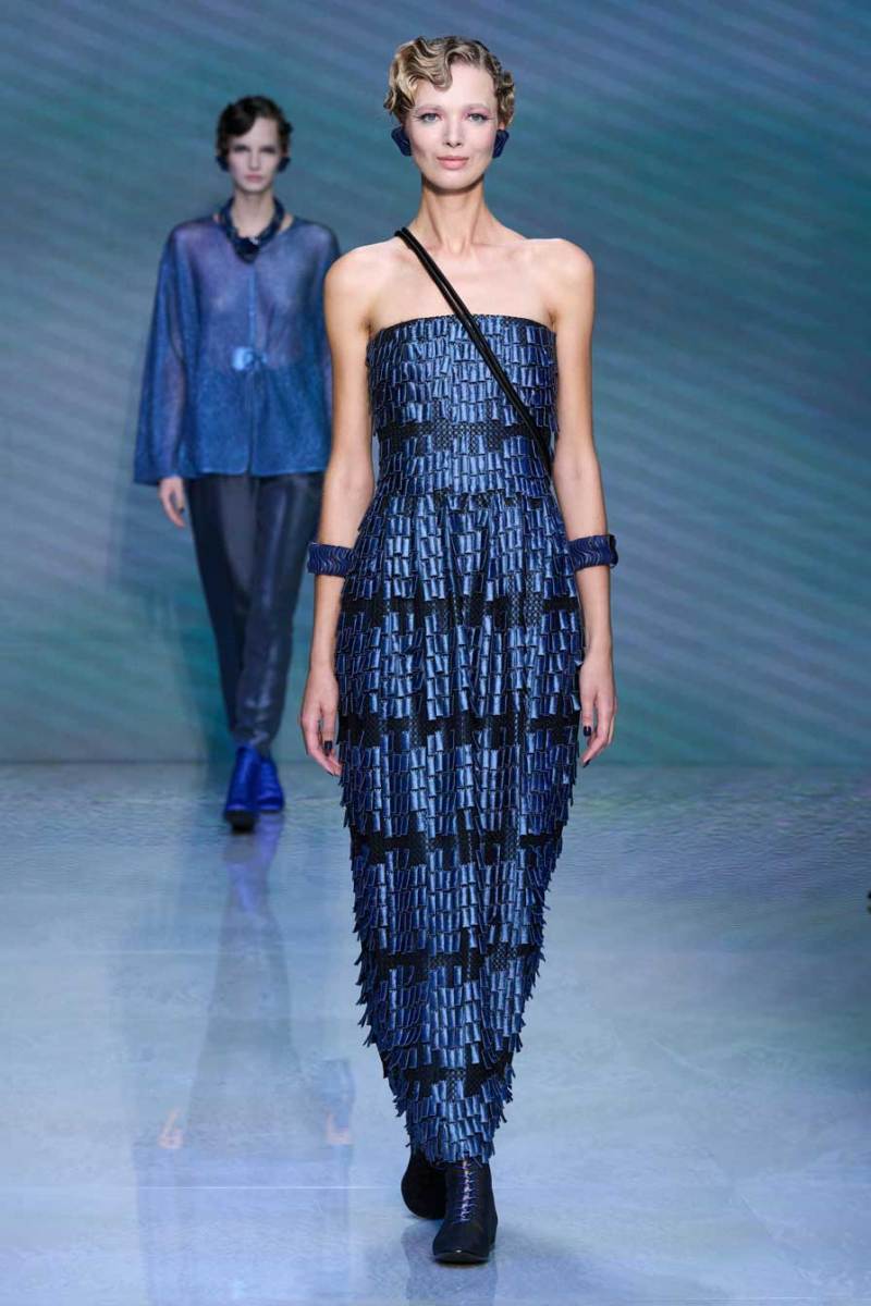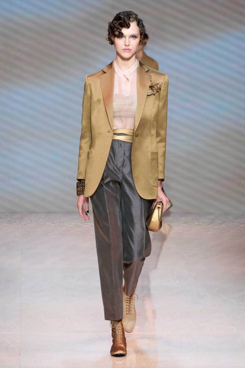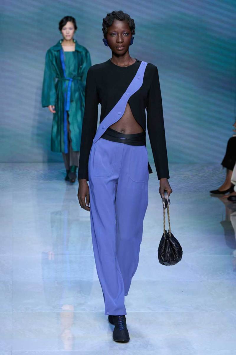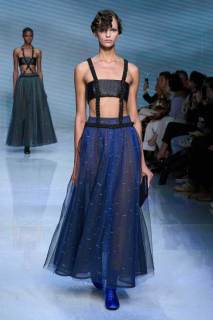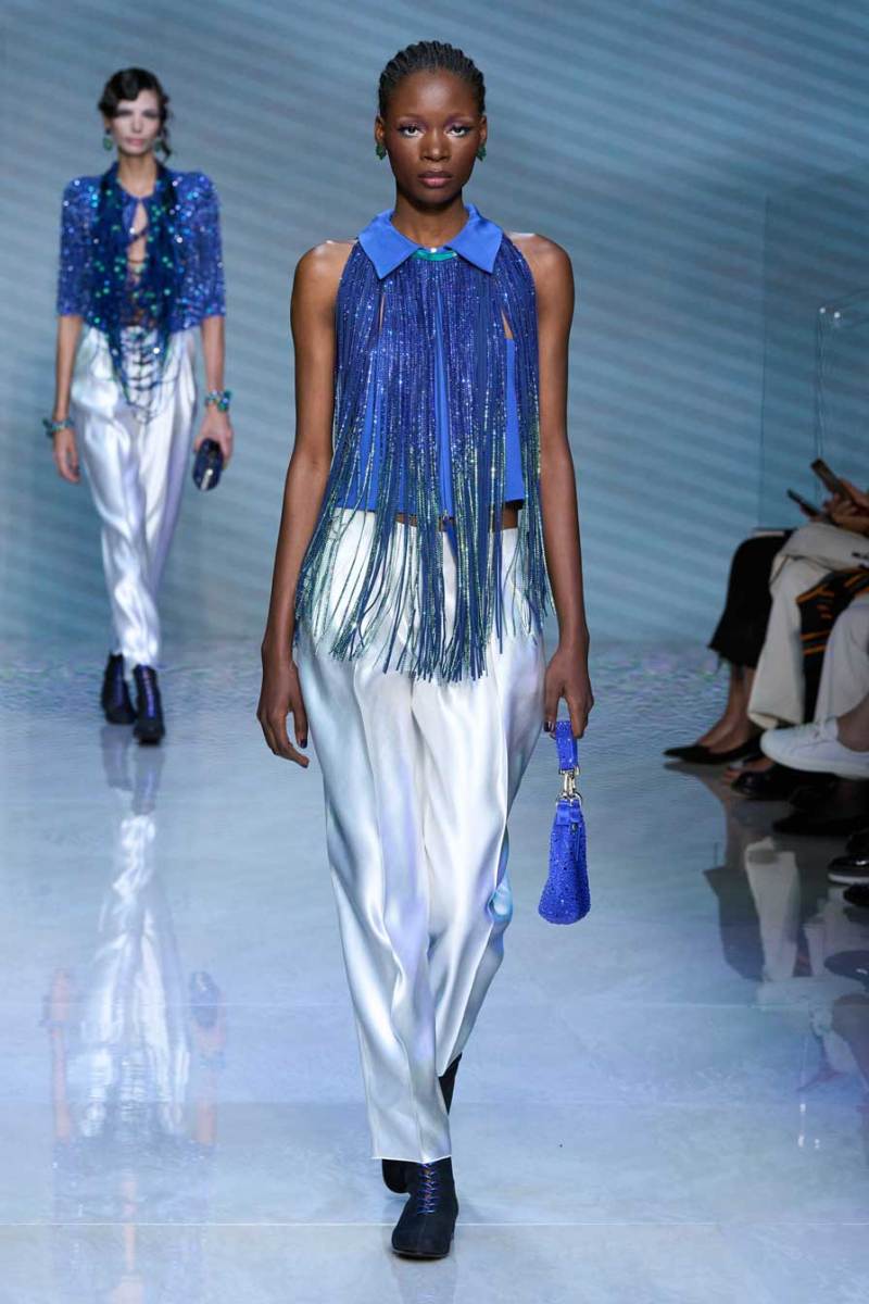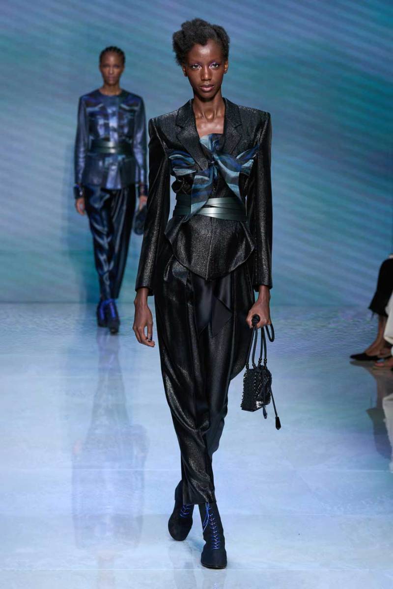 La donna secondo Armani è bella anche quando non ostenta sensualità o stravaganza (anche se non mancano top microscopici da portare insieme a bretelle dal gusto bondage). L’importante è che abbia un “guizzo negli occhi”, come sostiene lo stesso stilista, e che vada nel mondo a testa alta a portare le sue vibes di ambizione e indissolubile eleganza.