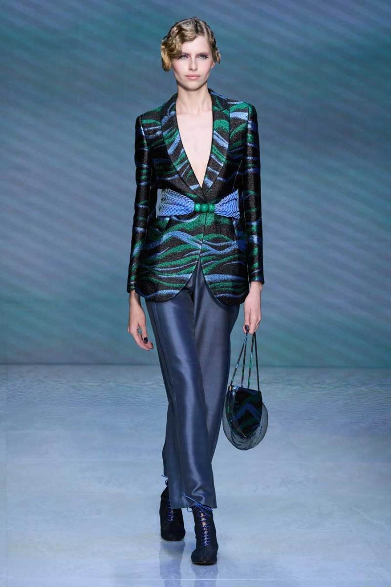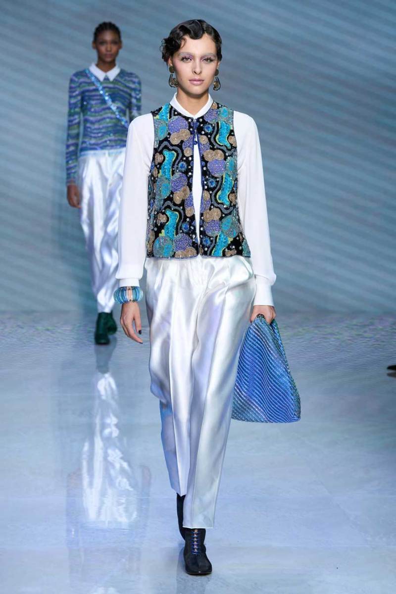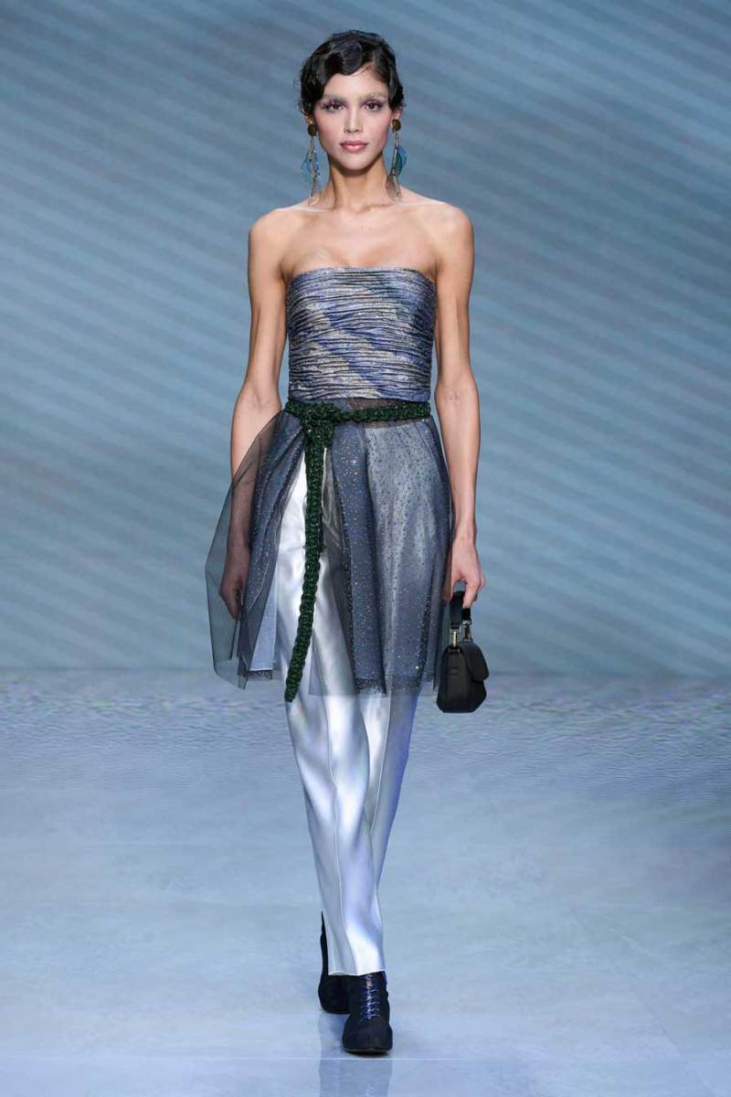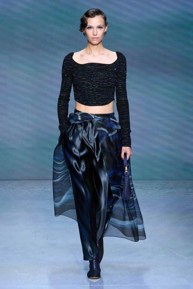 A sfilare sono così quei volumi che fondono sapientemente rigore sartoriale e morbidezza quasi liquida a cui il designer milanese ha abituato il suo pubblico. Tornano i pantaloni con piega frontale e silhouette quasi a palloncino, le giacchette corte senza collo, le sovrapposizioni fra tessuti materici e stoffe impalpabili. I motivi ondulati sono stampati oppure creati dai movimenti di materiali come l’organza, quasi ipnotici nel loro ripetersi e accompagnati dai bagliori scintillanti di cristalli e paillettes, chiamati a far sognare sulle frange di una camicetta o sulle applique di un vestito-sottoveste che accarezza le forme scoprendole quanto basta.