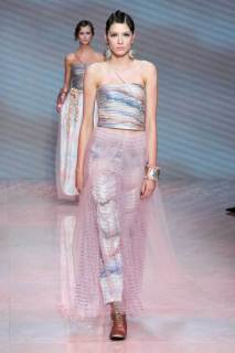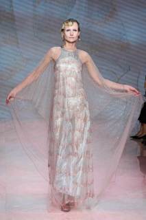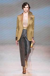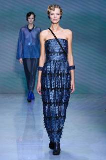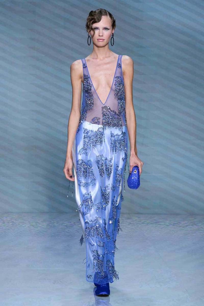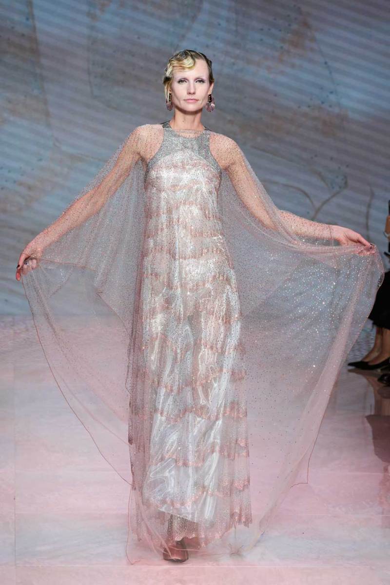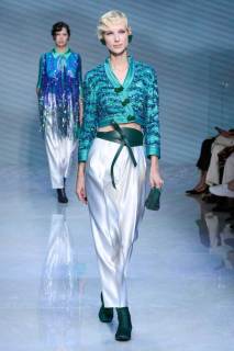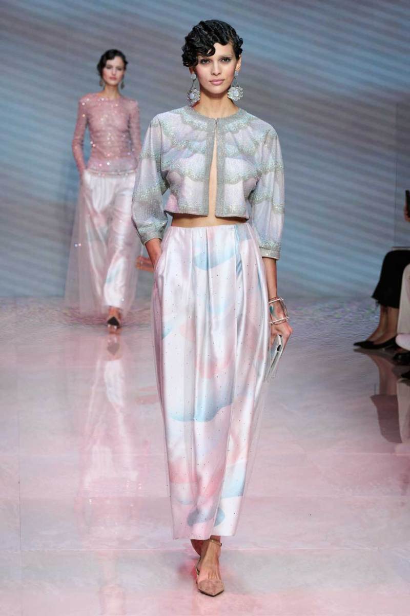 A sfilare sono così quei volumi che fondono sapientemente rigore sartoriale e morbidezza quasi liquida a cui il designer milanese ha abituato il suo pubblico. Tornano i pantaloni con piega frontale e silhouette quasi a palloncino, le giacchette corte senza collo, le sovrapposizioni fra tessuti materici e stoffe impalpabili. I motivi ondulati sono stampati oppure creati dai movimenti di materiali come l’organza, quasi ipnotici nel loro ripetersi e accompagnati dai bagliori scintillanti di cristalli e paillettes, chiamati a far sognare sulle frange di una camicetta o sulle applique di un vestito-sottoveste che accarezza le forme scoprendole quanto basta.