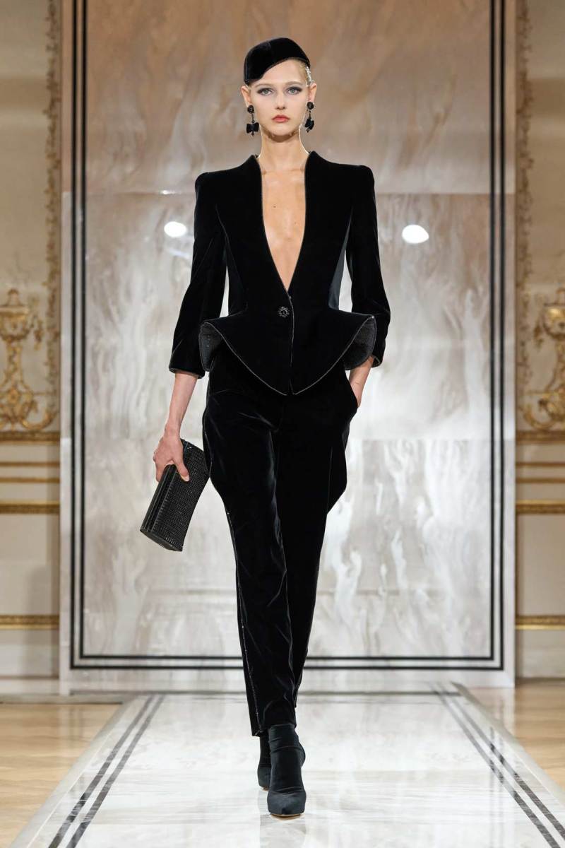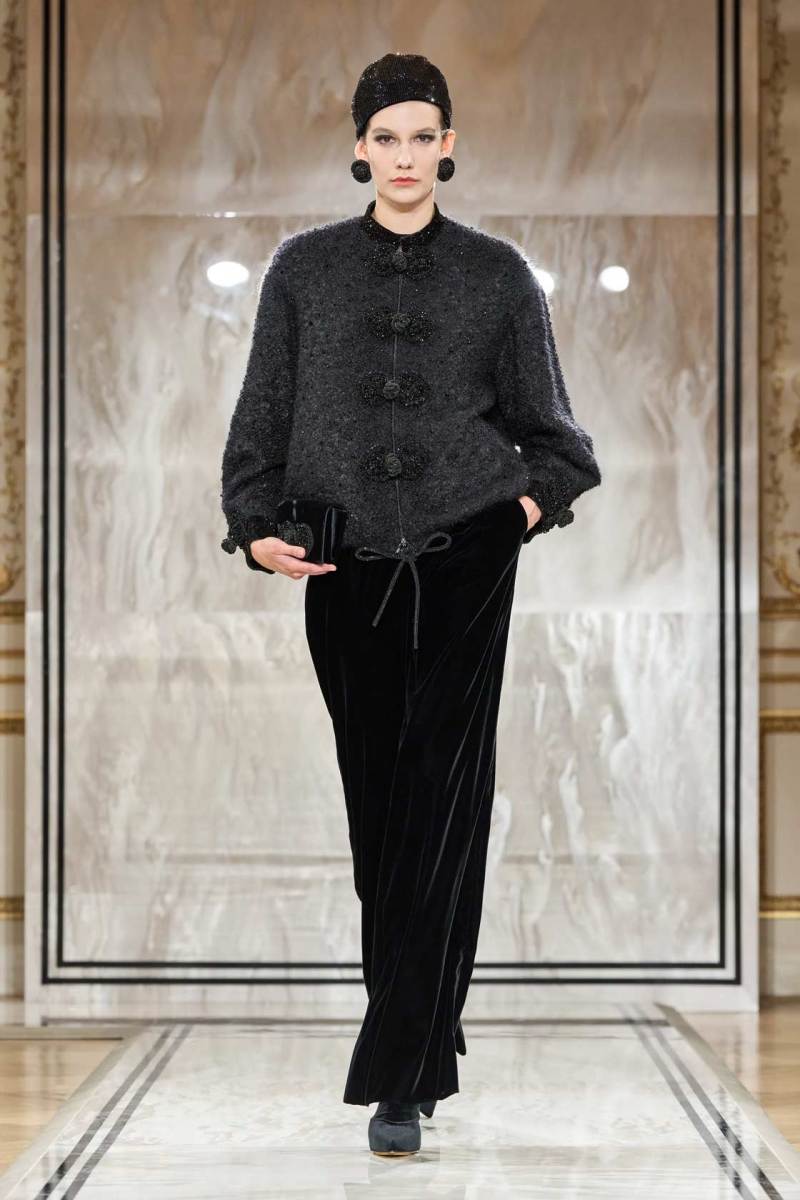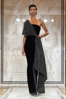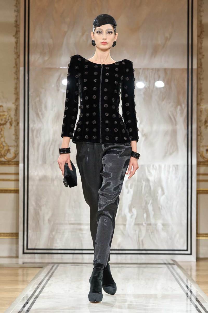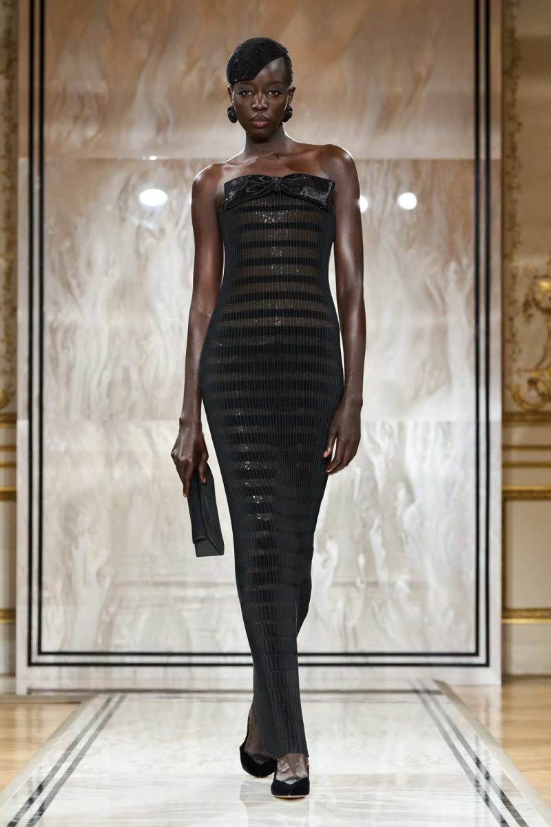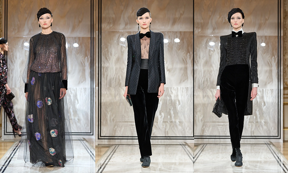 In scena a Parigi, nella cornice della Haute Couture, la collezione è un omaggio alla complessità del nero, che da codice classico si trasforma in linguaggio emotivo. Qui il nero non è mai assenza, ma presenza sfaccettata, materia viva, superficie da cui affiorano bagliori e contrasti. Una sfida che Giorgio Armani affronta con la precisione di chi sa che «lavorare con il nero significa non poter sbagliare», perché ogni imperfezione si amplifica, ogni taglio racconta.