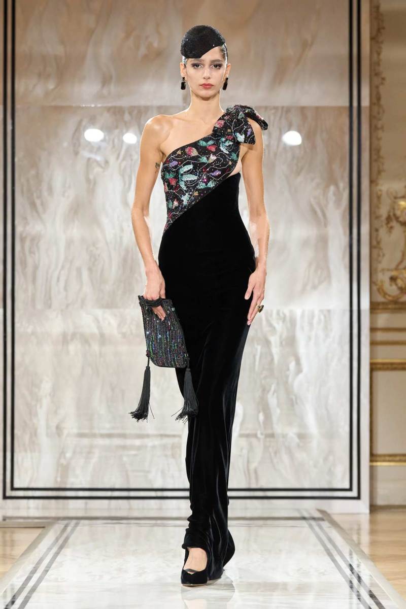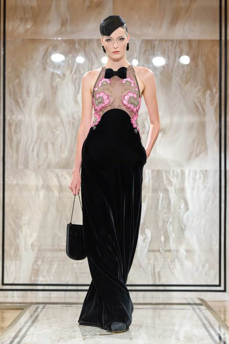Il nero domina, ma non è solo. Appaiono, come squarci di luce nella notte, ricami in tonalità vibranti — blu zaffiro, verde giada, ciclamino — e tocchi dorati che sottolineano senza invadere. Velluti profondi e sete metalliche accendono i tessuti di riflessi silenziosi, mentre cristalli e plastron trasparenti aggiungono un accento brillante che non acceca, ma accompagna.