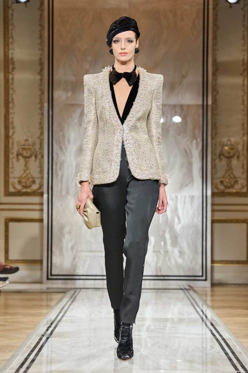 Le silhouette sono allungate, disegnate come tratti calligrafici: abiti fluidi che si muovono con eleganza trattenuta, smoking e frac riletti in chiave contemporanea, giacche strutturate che abbracciano il corpo con la grazia di un’armatura leggera. Il guardaroba maschile è un punto di partenza, ma viene filtrato attraverso un’estetica iperfemminile e raffinata, in cui camicie bianche, papillon e pantaloni affusolati dialogano con trasparenze, fiocchi e dettagli gioiello.