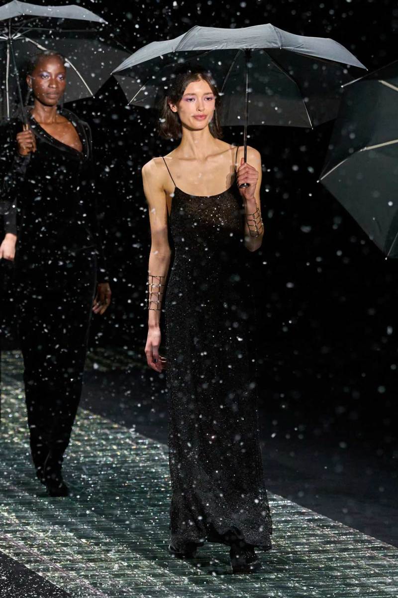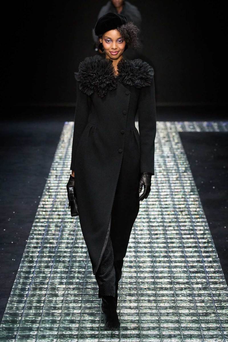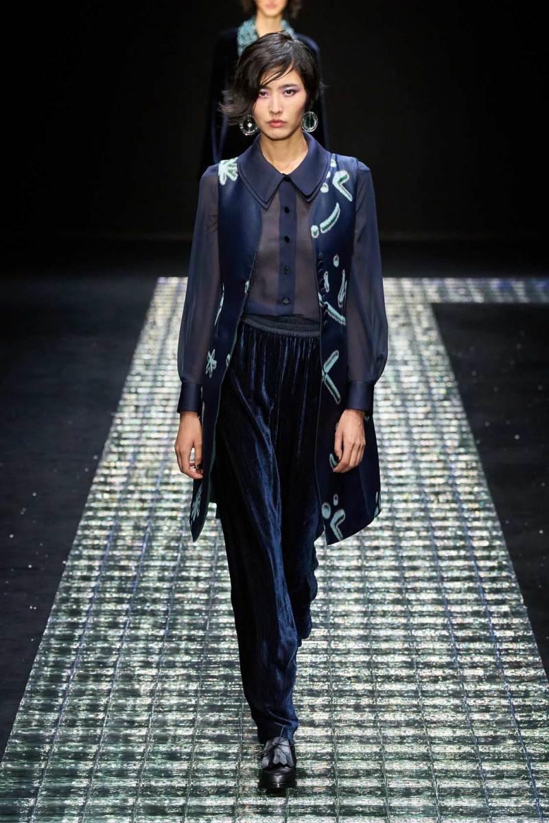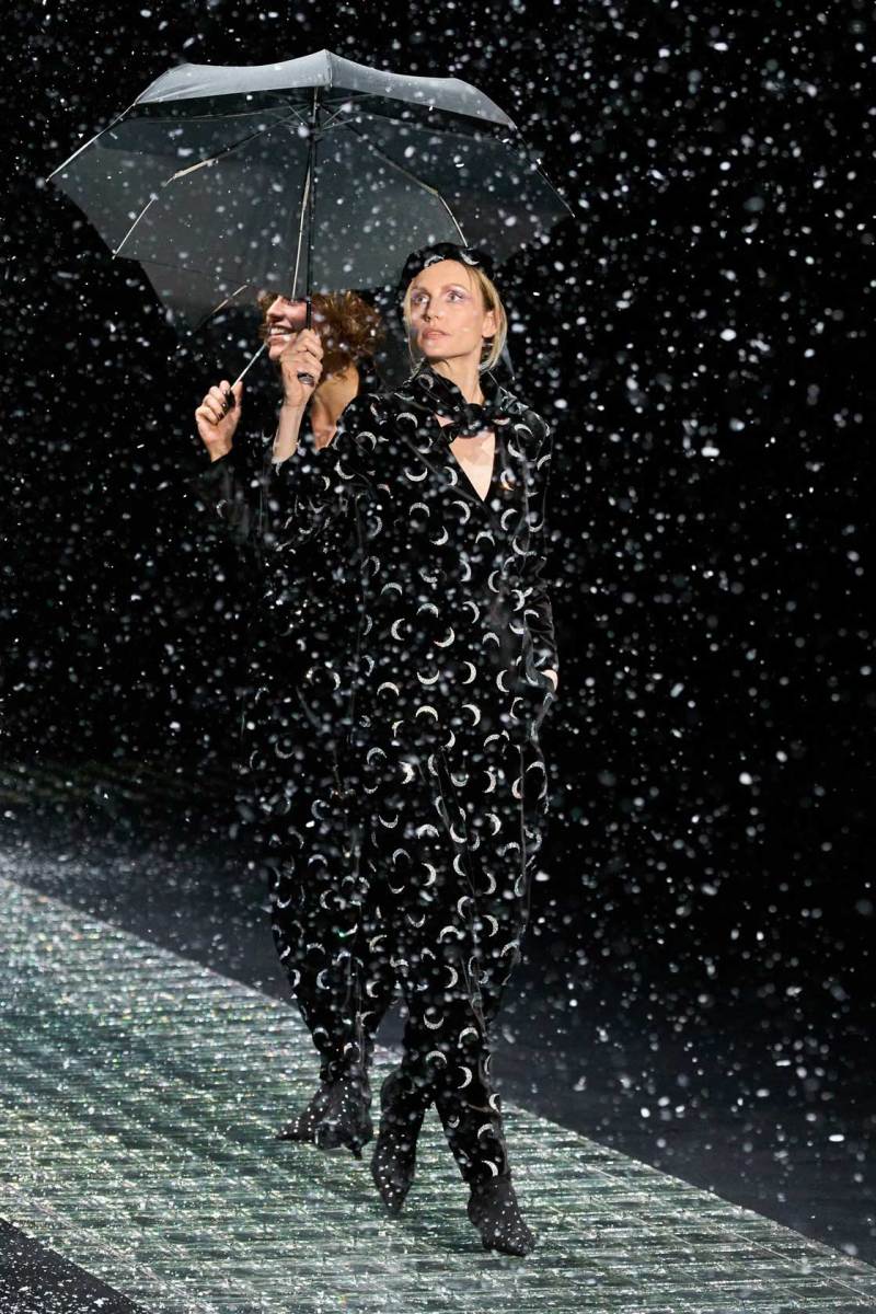 Nella prima parte della sfilata spiccano abiti più mascolini e pratici, tra cui completi, cappotti, giacche; più avanti si lascia spazio agli abiti da sera eleganti, luccicanti, neri. Tra i colori protagonisti, il grigio antracite e il grigio perla, il blu in varie sfumature, ma anche tocchi di colore. Immancabile il nero, che non risulta cupo e triste poiché si illumina di stelle, lune e decorazioni in argento.
