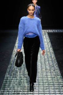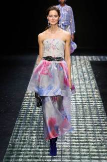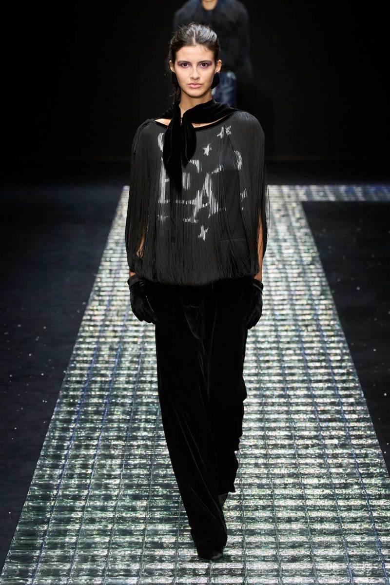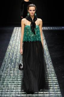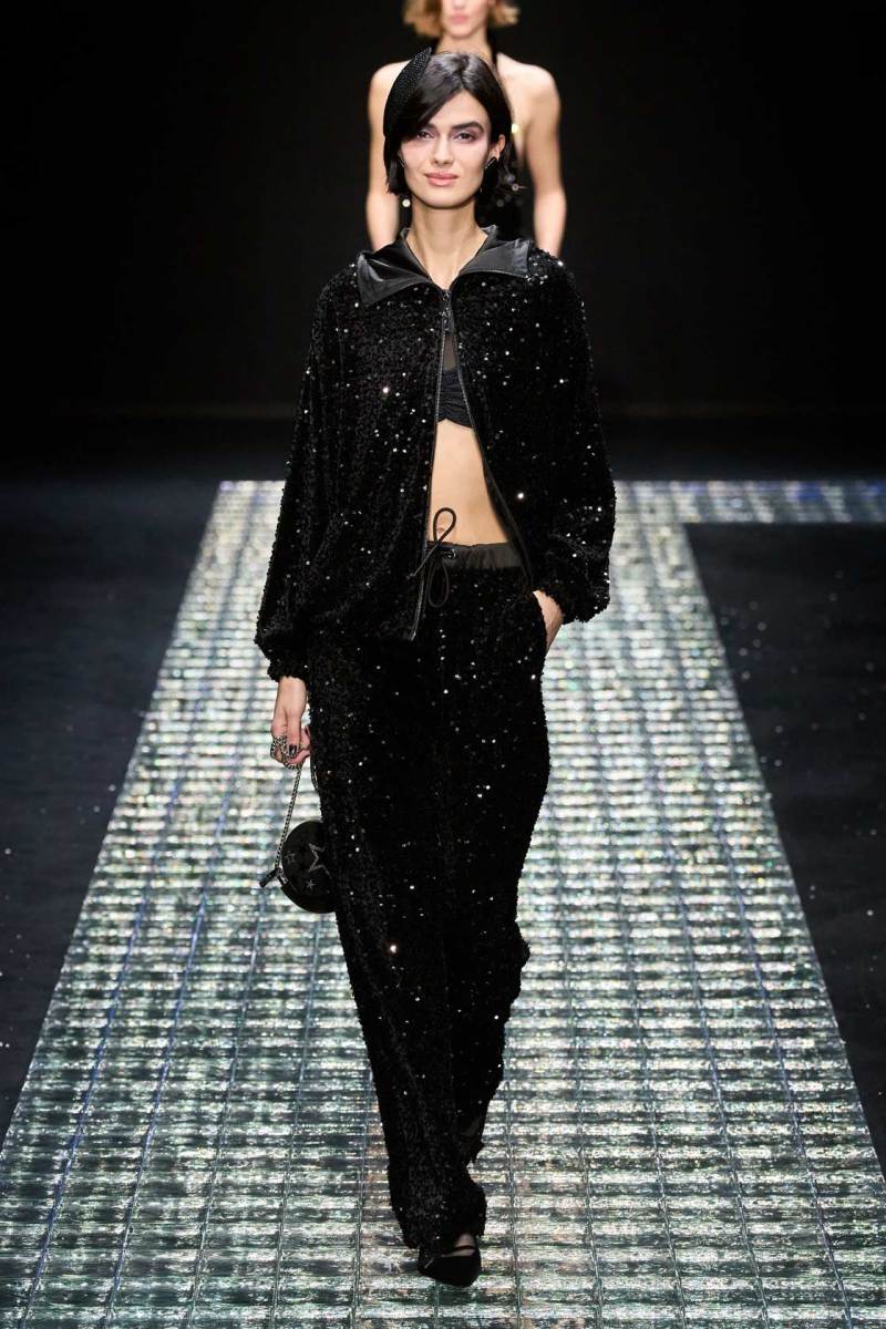 Gli abiti da sera proposti per la nuova collezione di Emporio Armani si arricchiscono di luci, stelle, catene, strass, e le modelle che li indossano sprigionano gioia, felicità e grandi sorrisi. Quella di Armani è un’eleganza sofisticata ma molto energica. Gli elementi della notte, tra cui luna, stelle e scintillii vari personalizzano i capi del guardaroba: alcuni top vengono tempestati da stelle, spicchi di luna; essi diventano veri e propri gioielli da indossare, super originali e che riflettono la luce.
