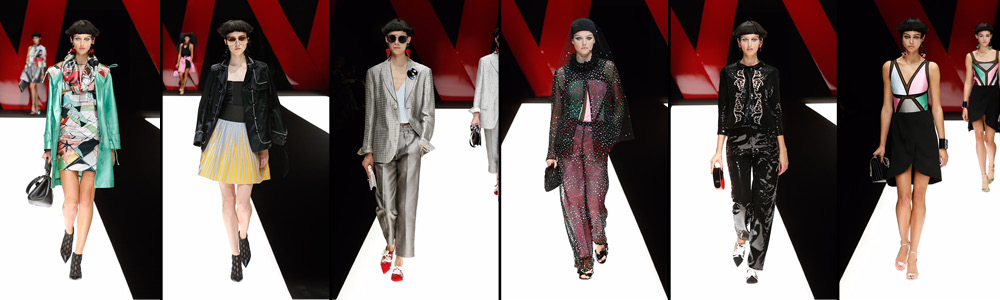 Gli abiti corti dagli orli sbiechi scoprono le spalle oppure sono da finta educanda, con trasparenze misurate; le asimmetrie sono calibrate, e movimentano il tutto con giochi di stampe e colori. Dopo il gran parlare di “athleisure”, Giorgio Armani ci mostra come la reale innovazione stia nei dettagli; il nuovo casual, che attinge dal guardaroba sportivo, viene servito su parka impalpabili con coulisse, si ritrova nei bomber lunghi di tessuto prezioso, o nella classica casacca orientale nera a profili bianchi, rivisitata per renderla un capo pratico ma ricercato.